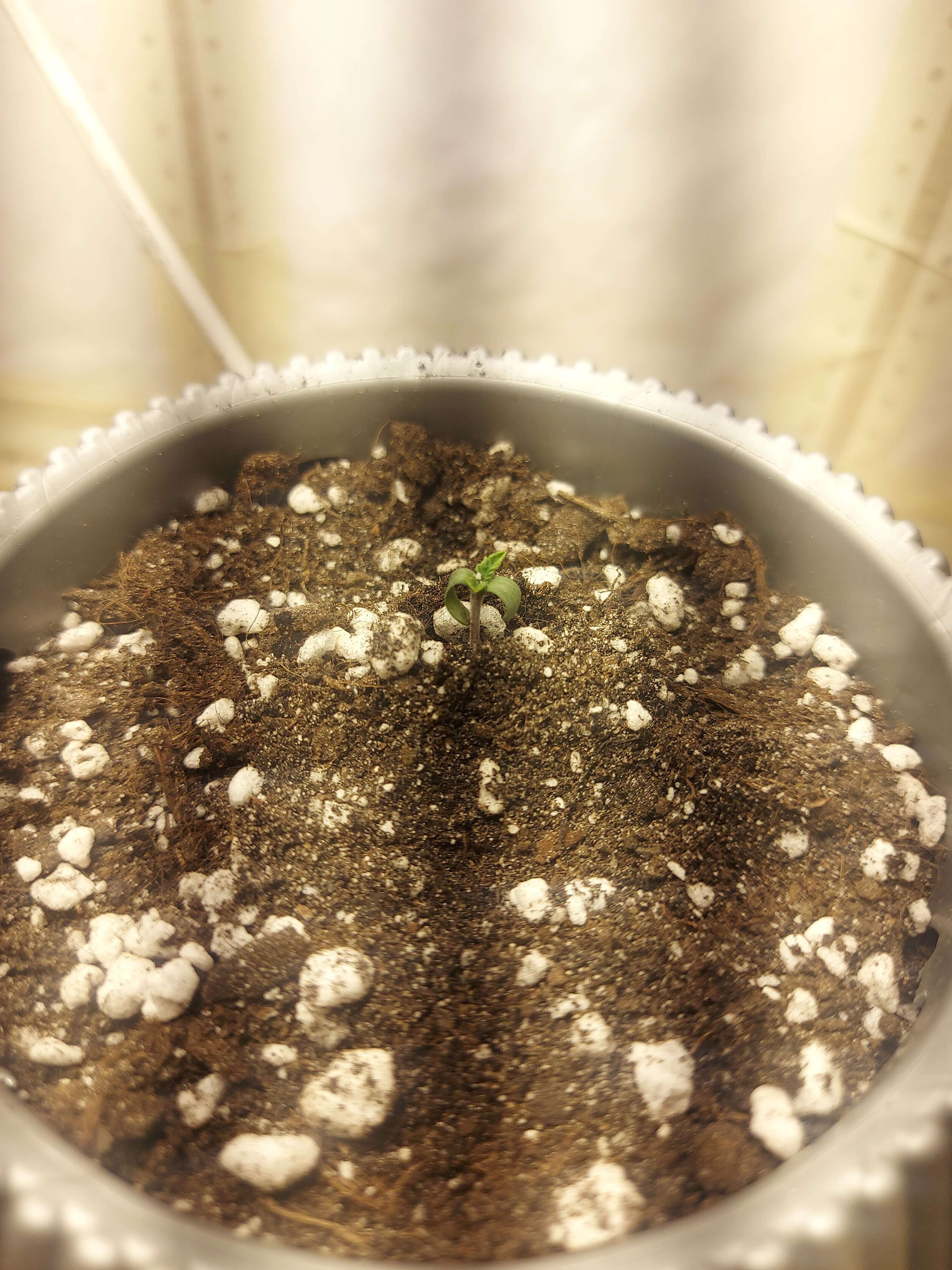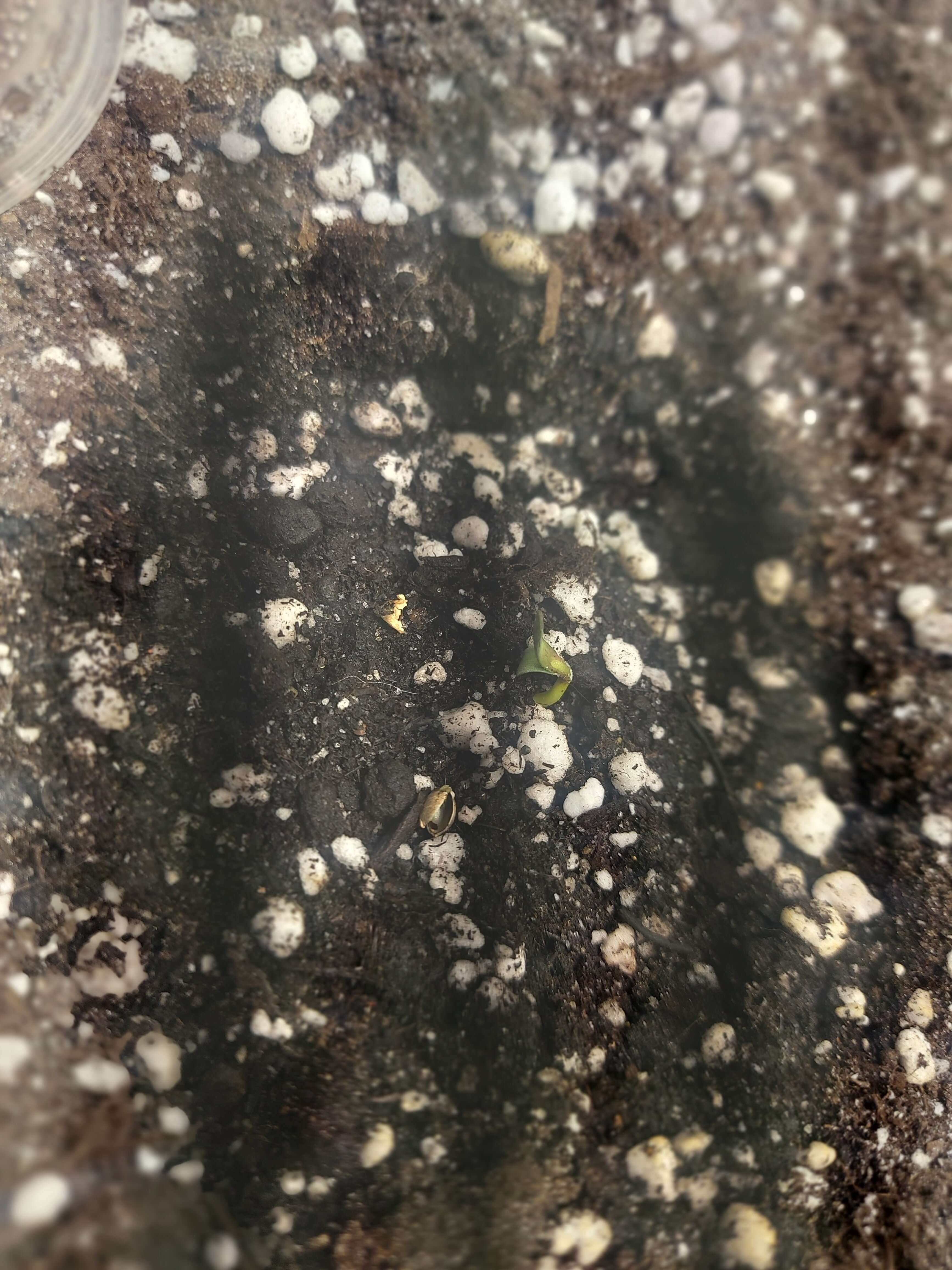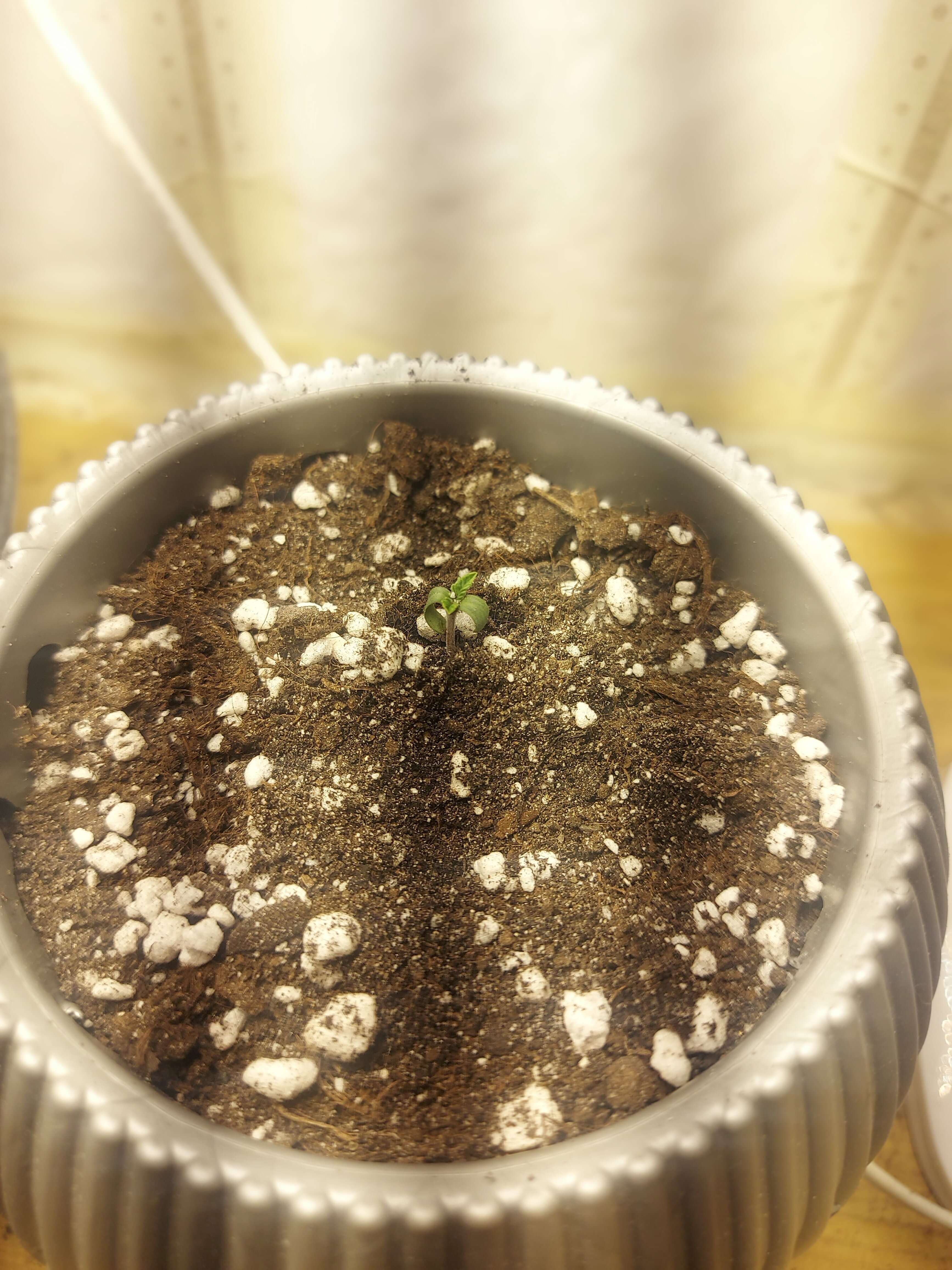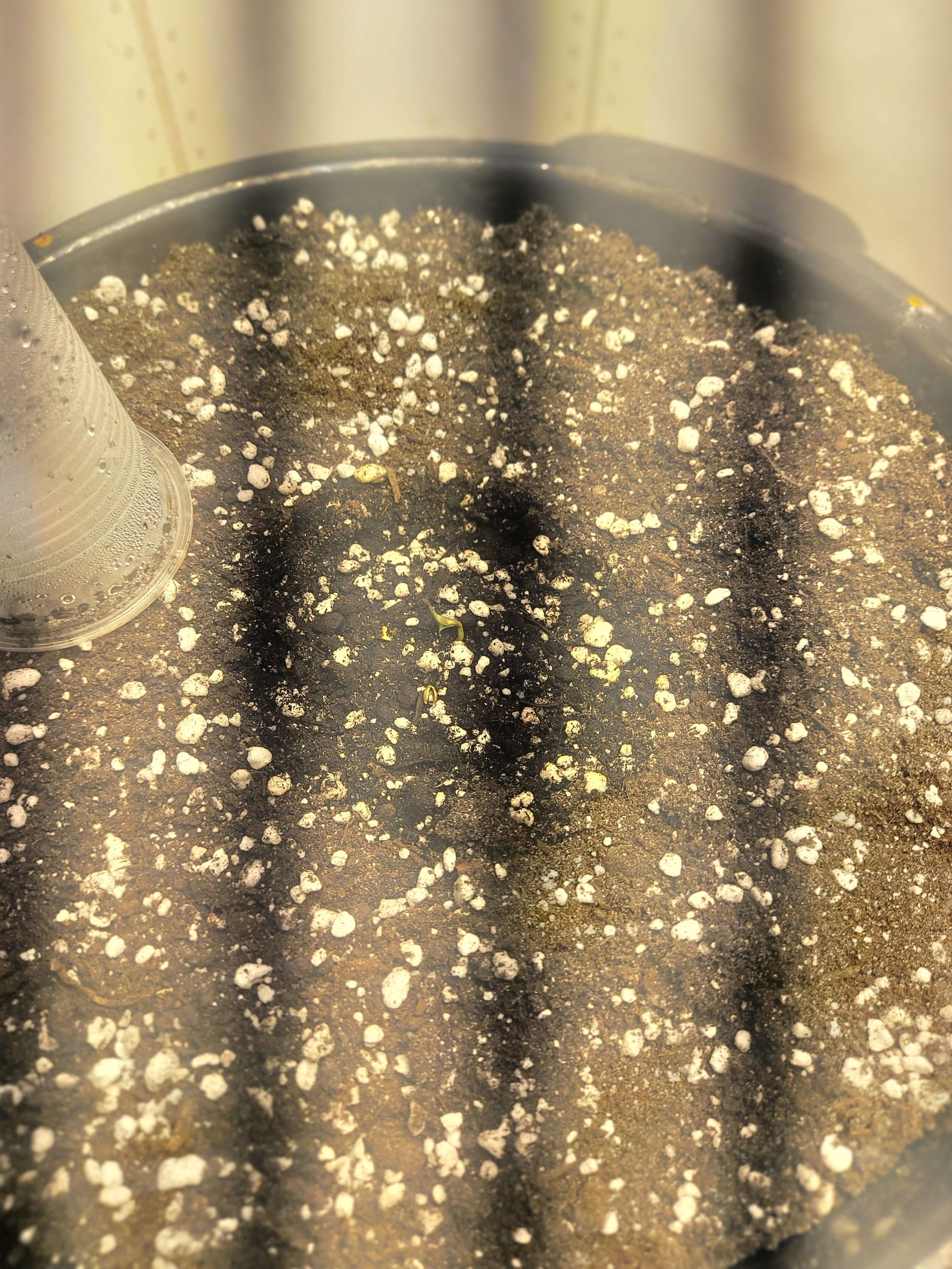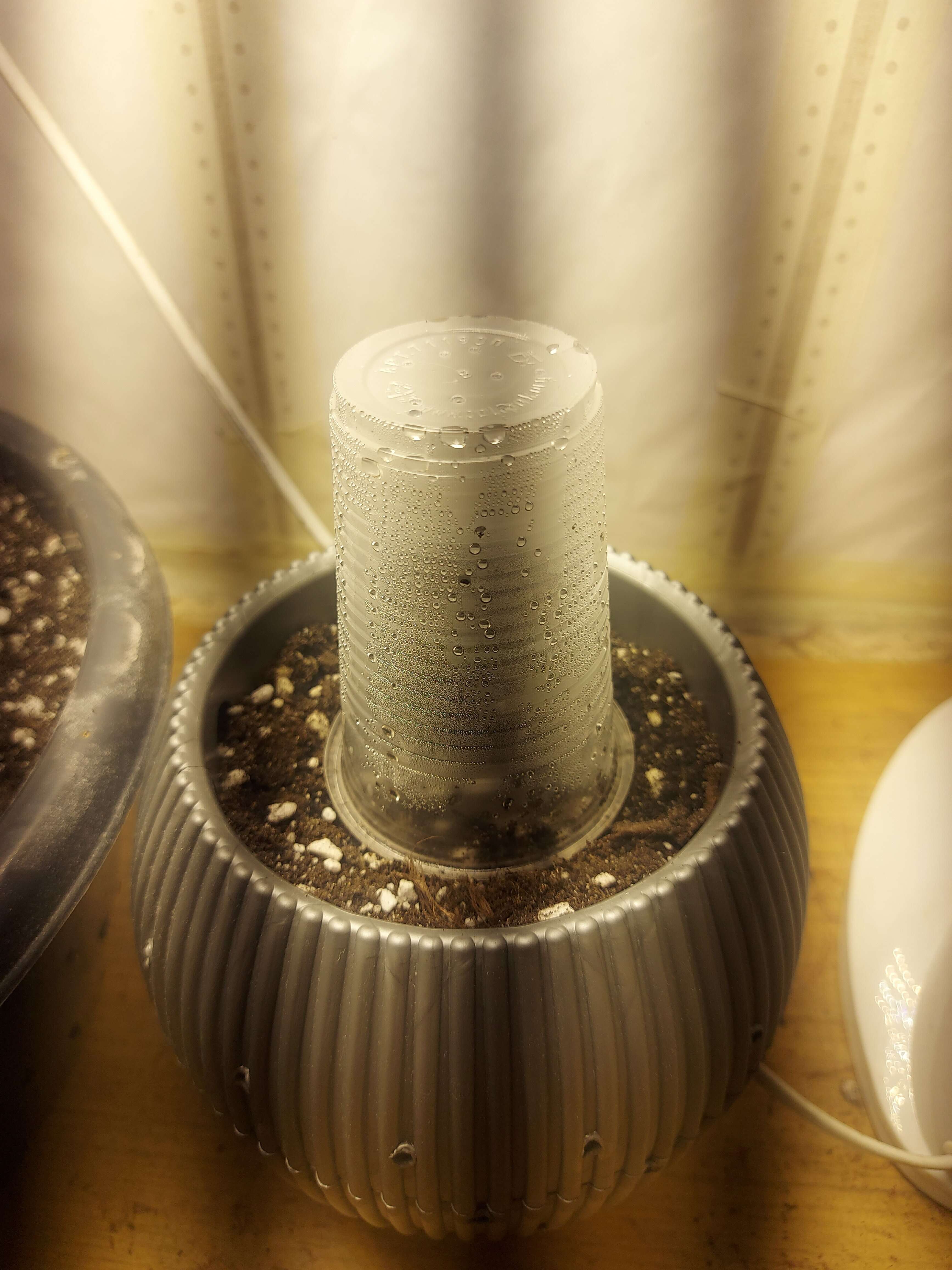 В силу того, что сначала собирался оба проростить в стаканчиках, но после решил сразу в конечных горшках..забыл пролить тары с землёй перед посадкой..посадил, накрыл стаканчиком и сразу под свет на 35 сантиметрах. Полил кстати сверху оба из шприца 10мл.и так пару раз в течении дня.