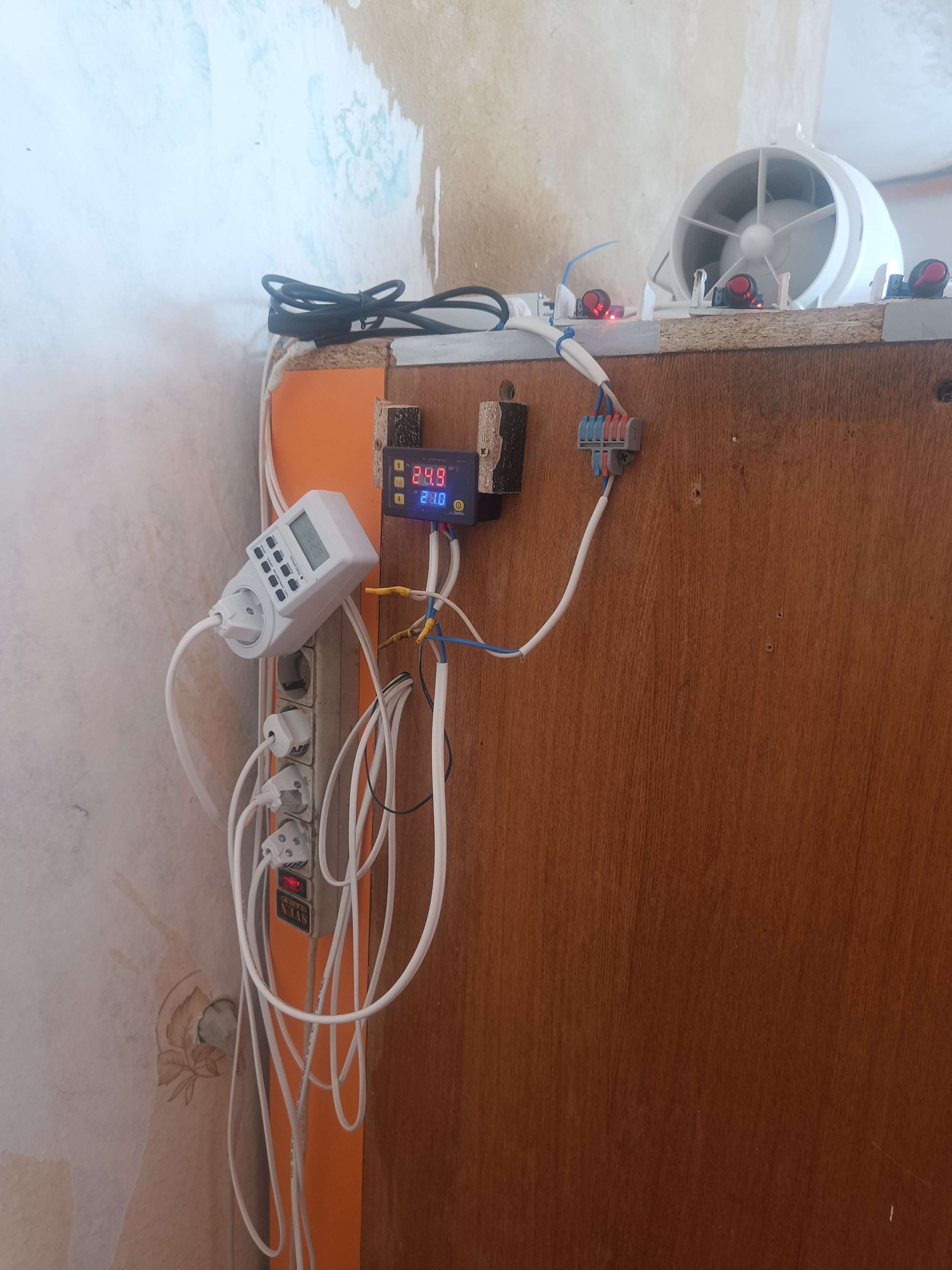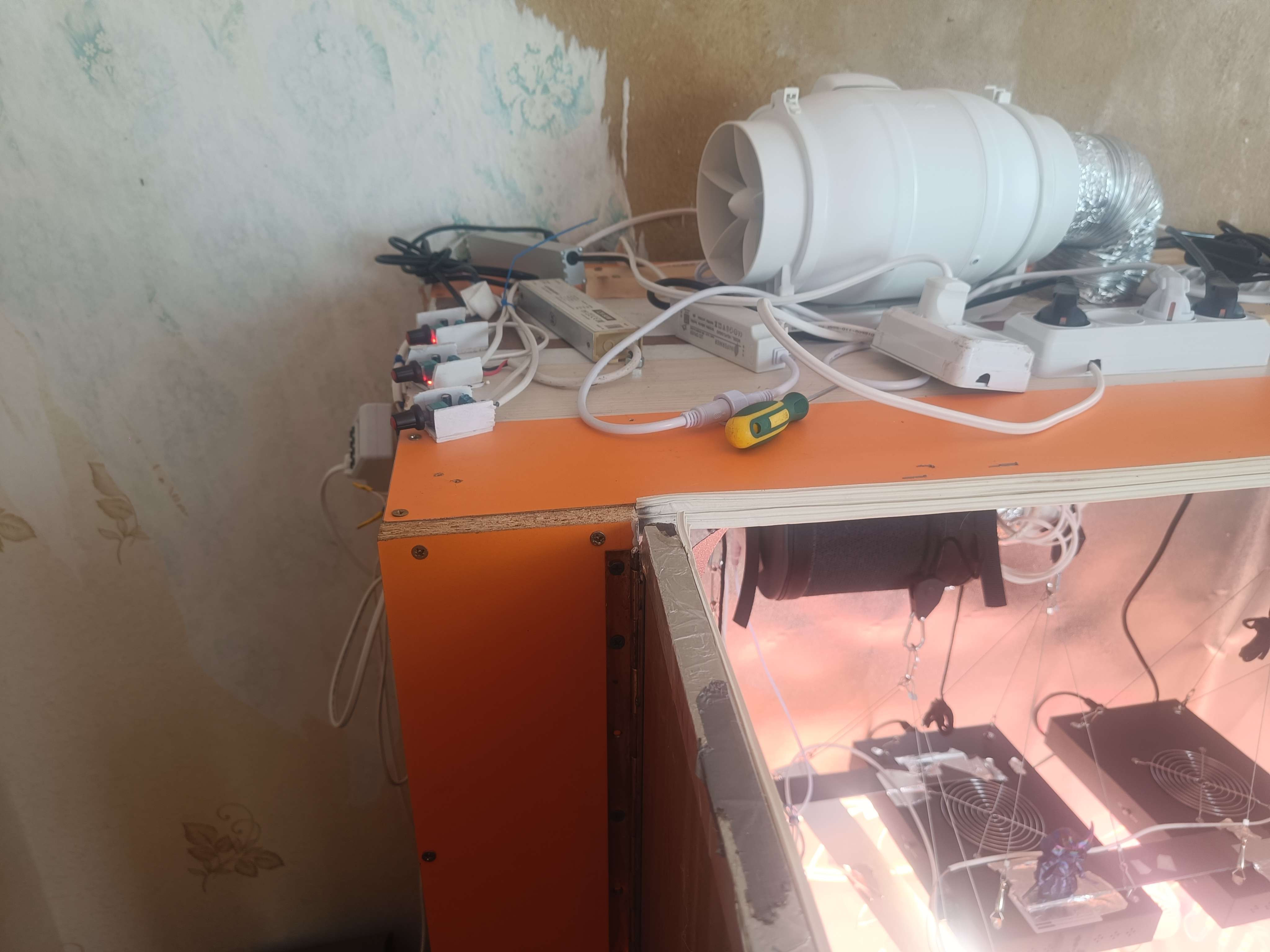 Вентиляция - 125|250 Вт канальник + кулер от компа 140мм н8а вдвул + фильтр угольный самодельный на входе + 2 венилятора внутри бокса на обдув с диммером + Угольный фильтр на 160 м3