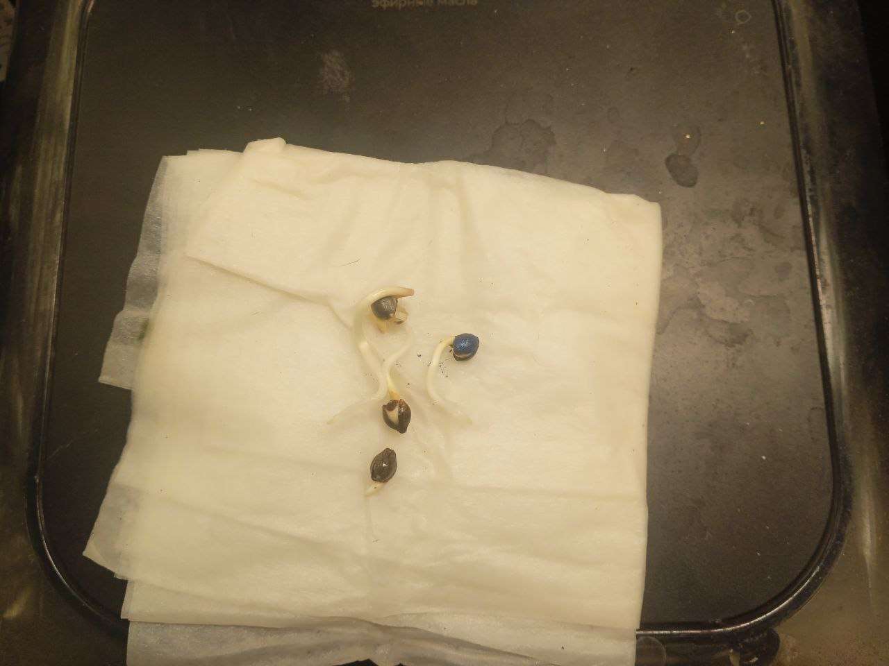 Получв козырный подгон от Семяныча, незамедлительно организовал проращивание для всей упаковки карамелек и 1 синей бонусной авто семки. Если честно, не помню что за сорт - выбирал остаточным принципом, чтобы можно было отличить без запарки. Впринципе, весь гров, вернее моё отношение к нему пройдёт в таком режиме - "без запарки". Слишком сильно дрожать над кустами нет возможности и времени. В июле (на момент проращивания) я как раз вышел на новое место работы и был погружён ей, а растениями занимался поскольку... Кстати о них. Мой принцип выращивания немного отличается от рекомендуемого: семечки кладу в рот и смачиваю слюной, после этого кладу в промоченную крановухой салфетку. Даже не ровняю PH у воды. То есть там что-то около 7.9 PH, после сворачиваю и кладу в плотно прикрытый пакет и жду. Через три дня корешки около 1 см и можно приступать к посадке
