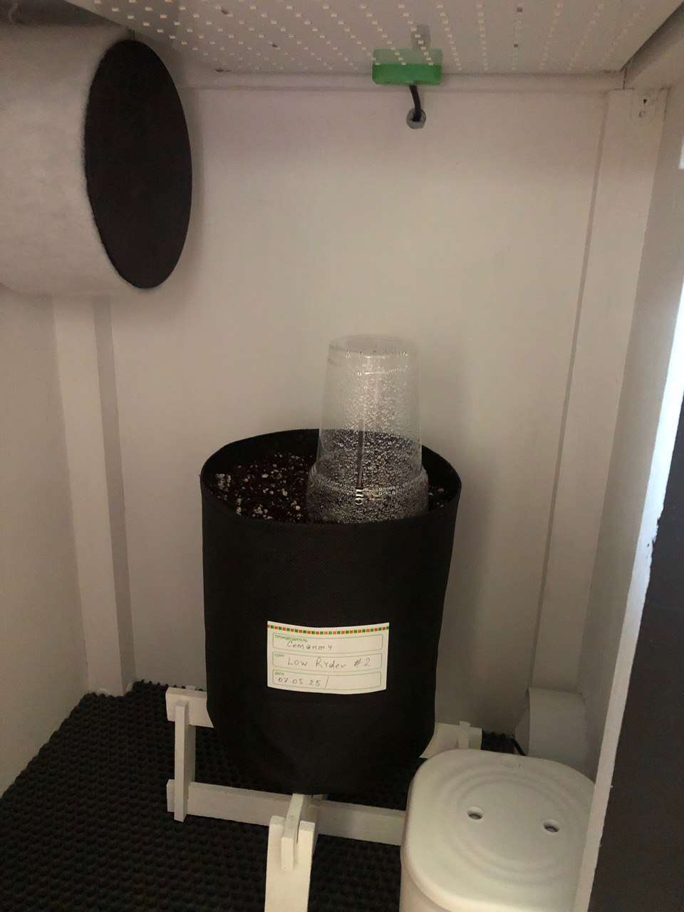 Для этого были приготовлены кусочки пенопласта, аккуратно нарезанные мной и уложенные на дно горшка - для дренажа. За ними последовал замес из почвосмеси Allmix BioBizz (5л) и перлита "Сила юга" (1л), без какого-либо уплотнения. Почва совершенно немного полита, торжественно сделана лунка в пол-фаланги указательного пальца, в нее не менее торжественно была погружена семечка, прикопана и убрана в бокс, на новое и постоянное место жительства. В добрый путь, так сказать.