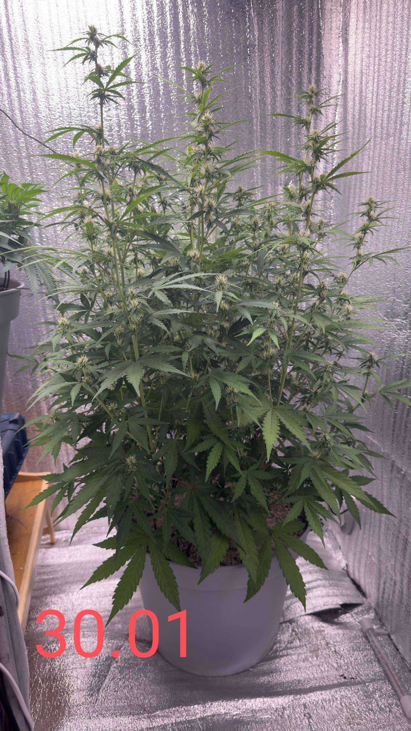 01.02 начал обрастать трихомами, сейчас уже уверенно говорю, по таблице с 8 недели нужно было топмакс 4мл/л давать, сегодня ещё 3л компота дал, с дренажом ппм 200, значит точно не профицит у растихи, поэтому думаю всё же были дефы небольшие и светом давил, исправлено, наблюдаем