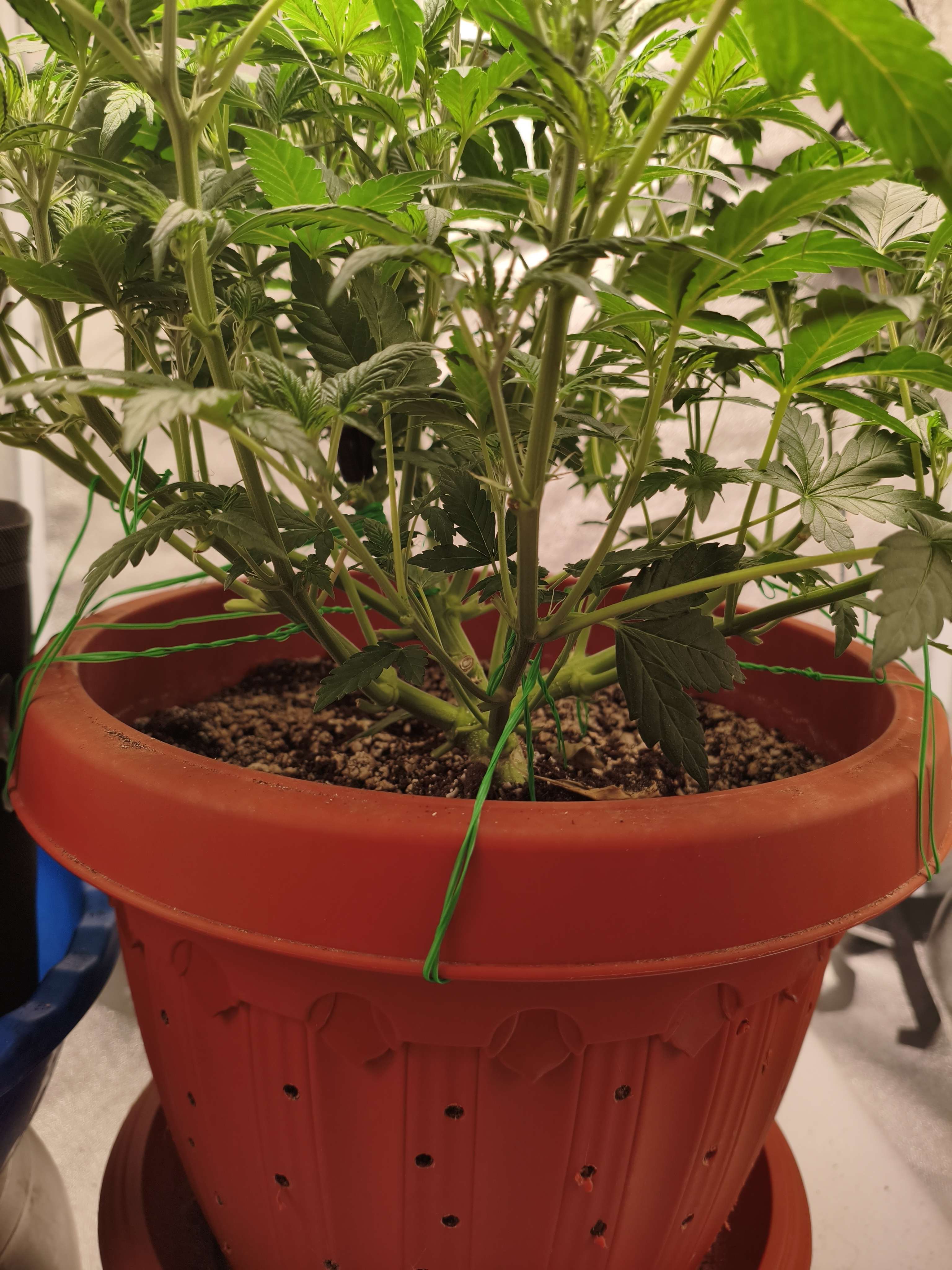 Итак всем доброго времени суток ребята,в общем и целом раста продолжает развиваться и расти,не получилось как хотел оставить ее на пару недель без деформации,так как разрастающейся лапухи закрывают свет,плюс минус перспективным кодам,поэтому подбирал почти полностью все лапухи с нижних ярусов,в общем даже не считал,но очень много,Растишка будто даже лучше стала дышать и чувствовать себя,поэтому пока продолжаем в этом же ритме,убираем,подгинаем,убираем подгинаем и все в этом же духе,клипса сломала центральную колу,не помню на этой или на прошлой недели,залечил изолента,пока вроде растет и продолжает отращивать стигмы,в остальном все по стандарту,на неделе полил один раз минеральным компотом,и ещё раз бизовским,теперь пока буду чередовать их,посмотри как раста отреагирует,сегодня третий полив за неделю,лью по полторахе раз в 2-3 дня,пока вроде едем,на краях верхних листьев,был видимо не большой ожог от лампы,немного подкорректировал высоту,в остальном все пока вроде бы нормально,фото выложу когда раста проснется,пока только фото ботвы)))