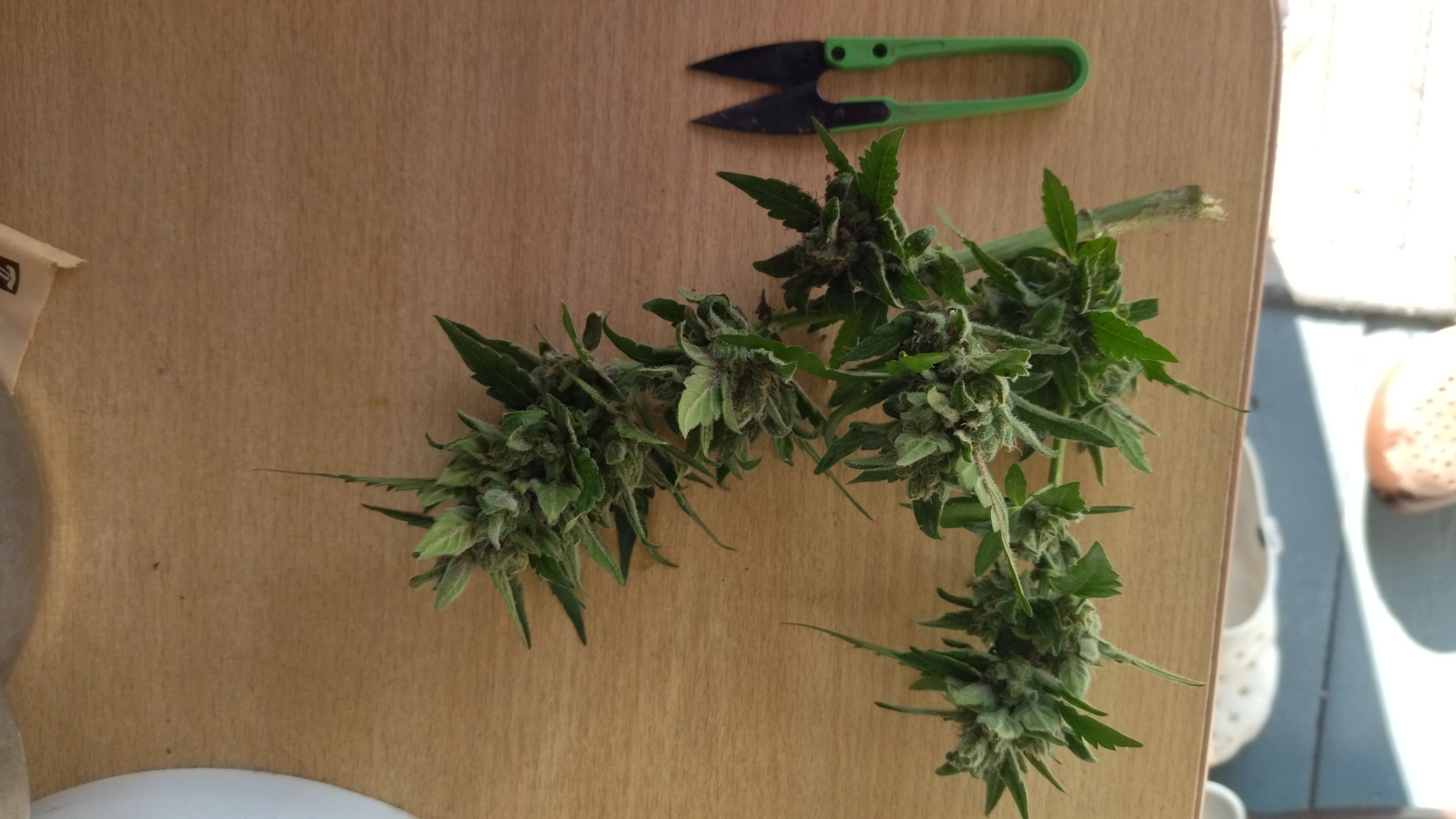 Остался один бонусный карлик. Сантиметров 35-40 максимум. Вот такой недоросль, однако трихомы красивые. Холодно уже в теплице, пора снимать