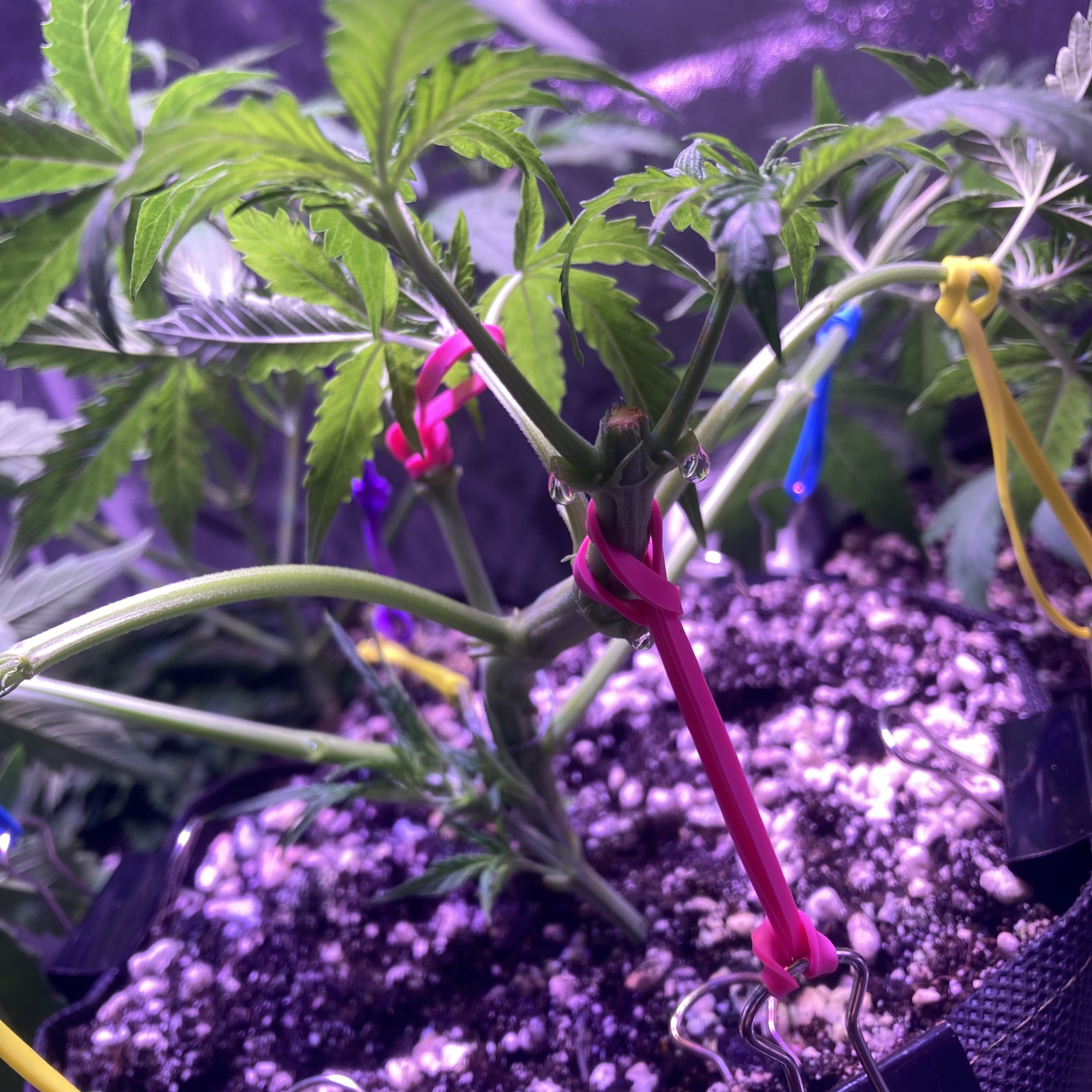 Рок-машина мощно тянет резину, словно пытается сорвать прищепку! Благодаря низкострессовой тренировке, свет ровно расходится по кроне, а побеги друг другу не мешают. Дефолиация убирает тень и добавляет пространства для развития. Запах полевой травы стал насыщенным и едким.