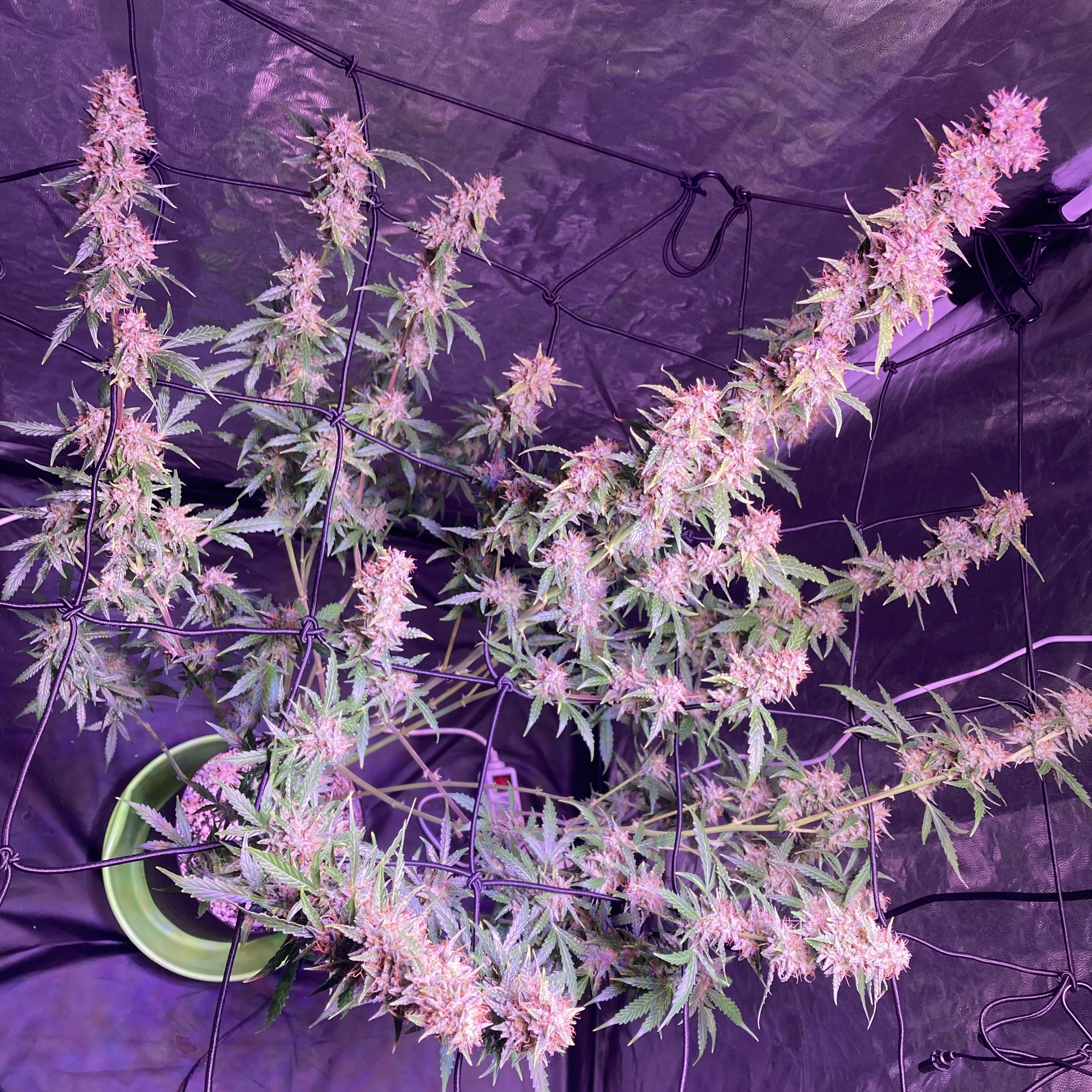 Бонусом вам пара фото с прошлых гровов этого стрейна: на первом шихи рядом с сигами, растила в 20 л. кашпо под ДНаТ (и ДРИ на веге). Снимала по 120 г., но долго: за 120 дней. На другом пять мешков по 10 л. под Q-бордами, 87 дней, по 55 на часах.