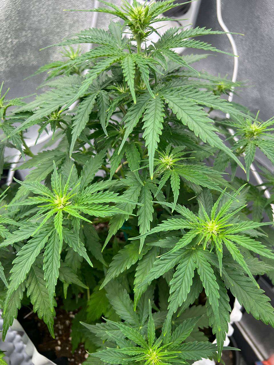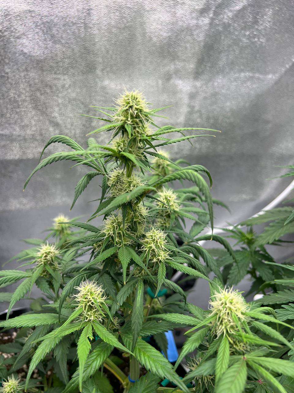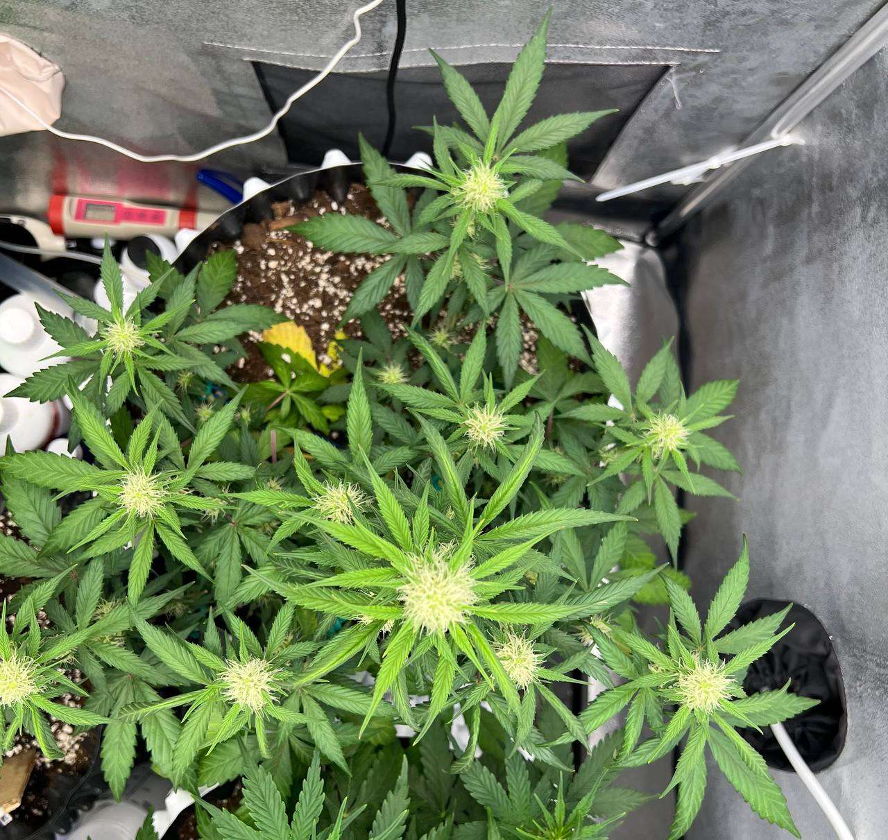 Поливал красоток через день, чередуя компот с чистой водой два через раз. Люся (50 дней) уже цветет во всю. Всё, вроде хорошо. Шишки растут и набирают вес. Красота! Звездочку (40 дней / 34 см) решил не гнуть. Густая малыха.