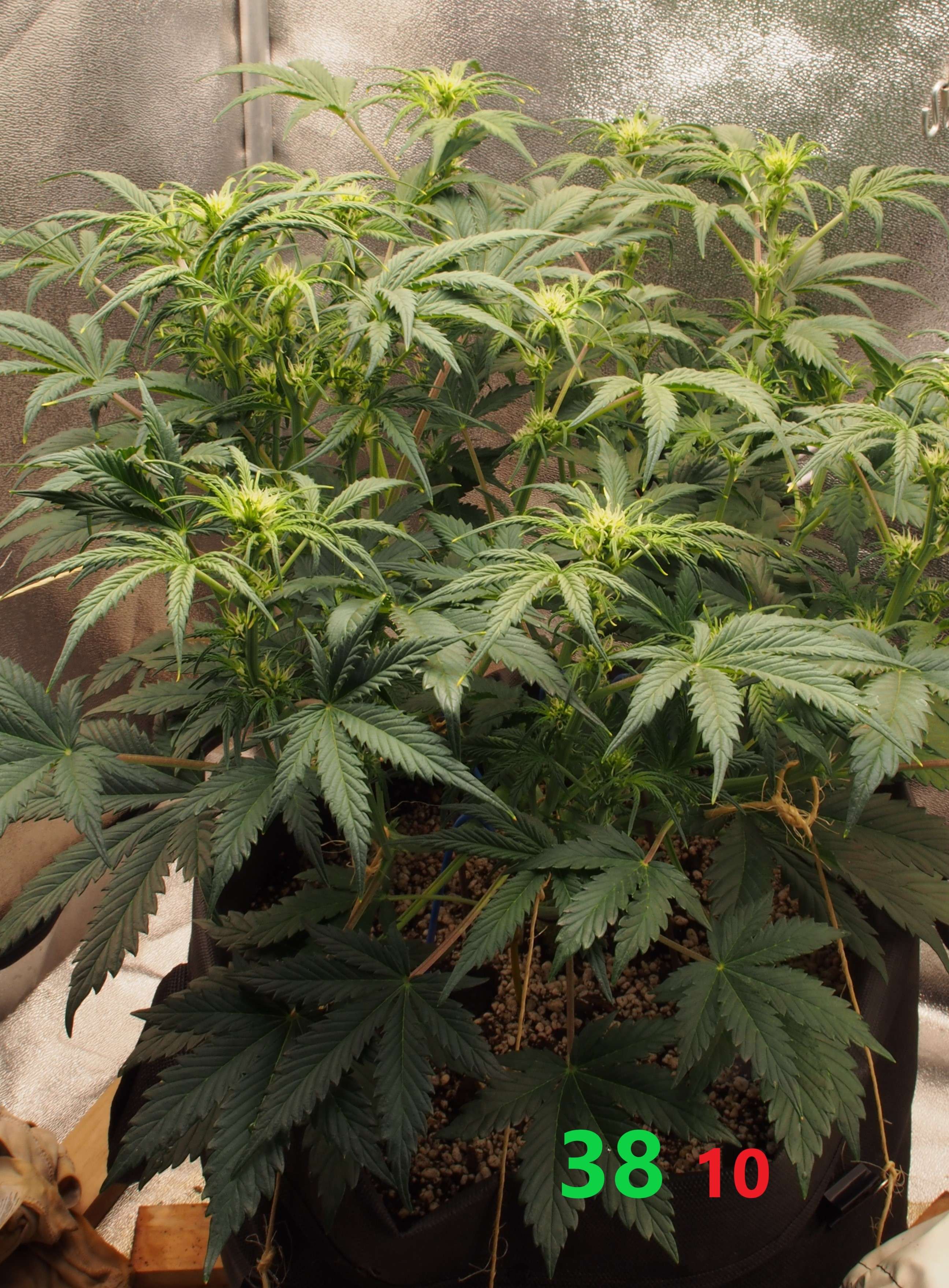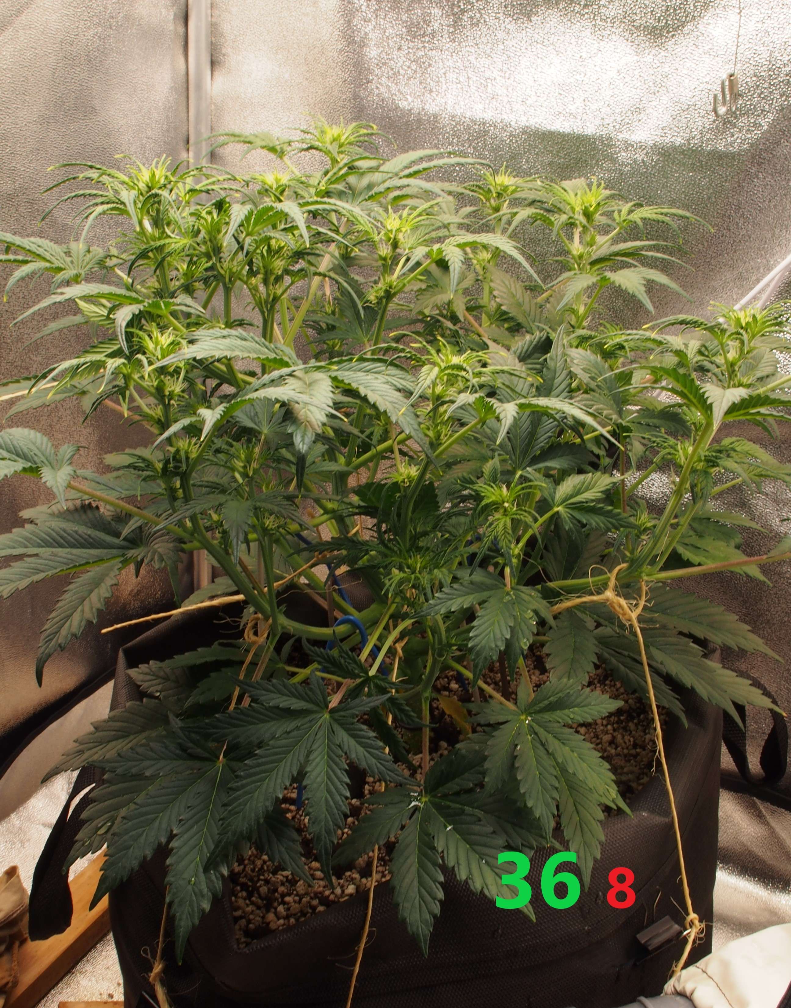 2-я неделя цвета. Растишка заметно выросла вверх - поэтому применяем только LST. Тянем главную колу вниз и стараемся создать несколько равных по уровню верхушек. Листьев много, но дефолиация минимальная - нет каких-то огромных лопухов, а резать кучу мелких листочков я не хочу.