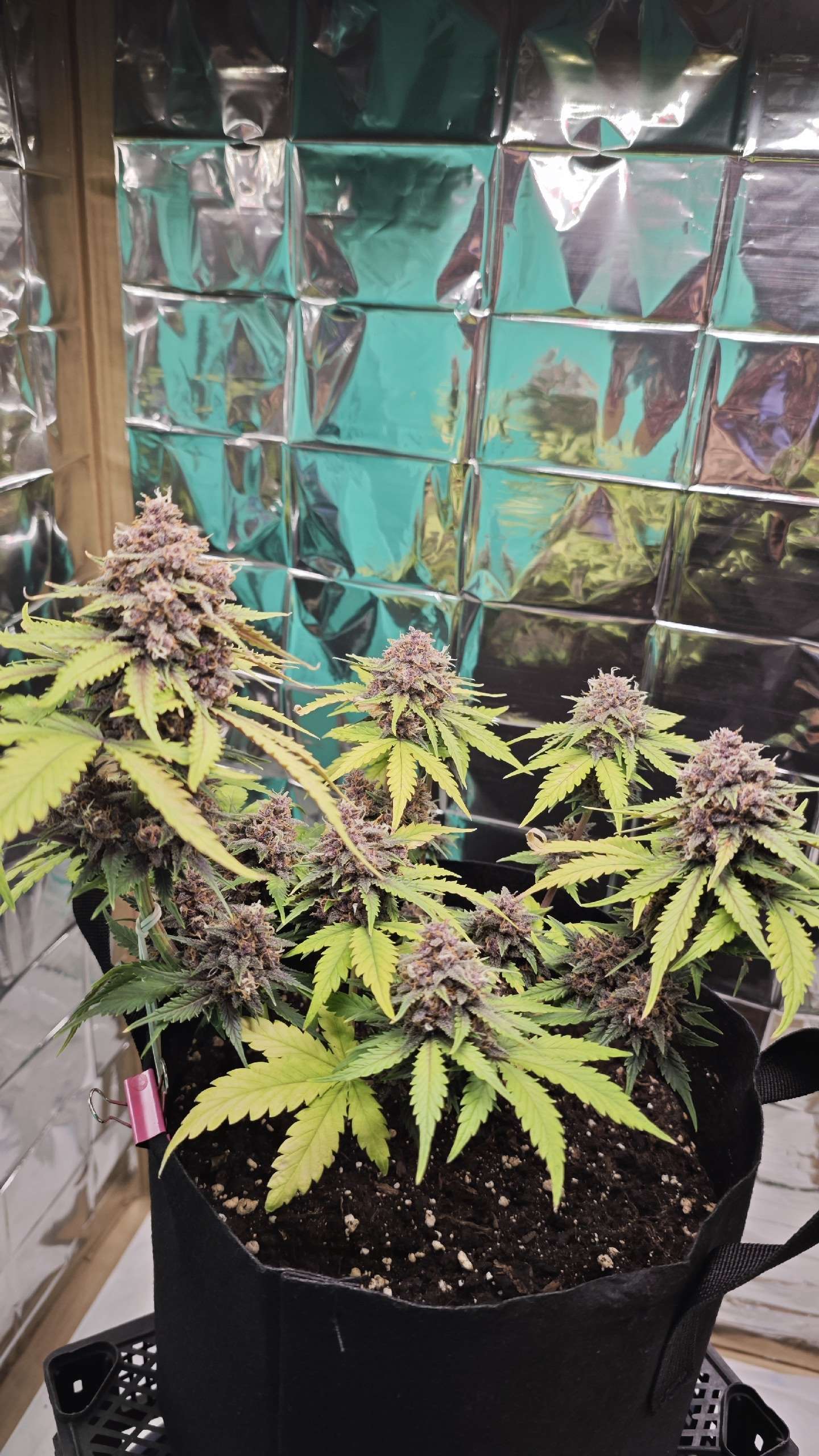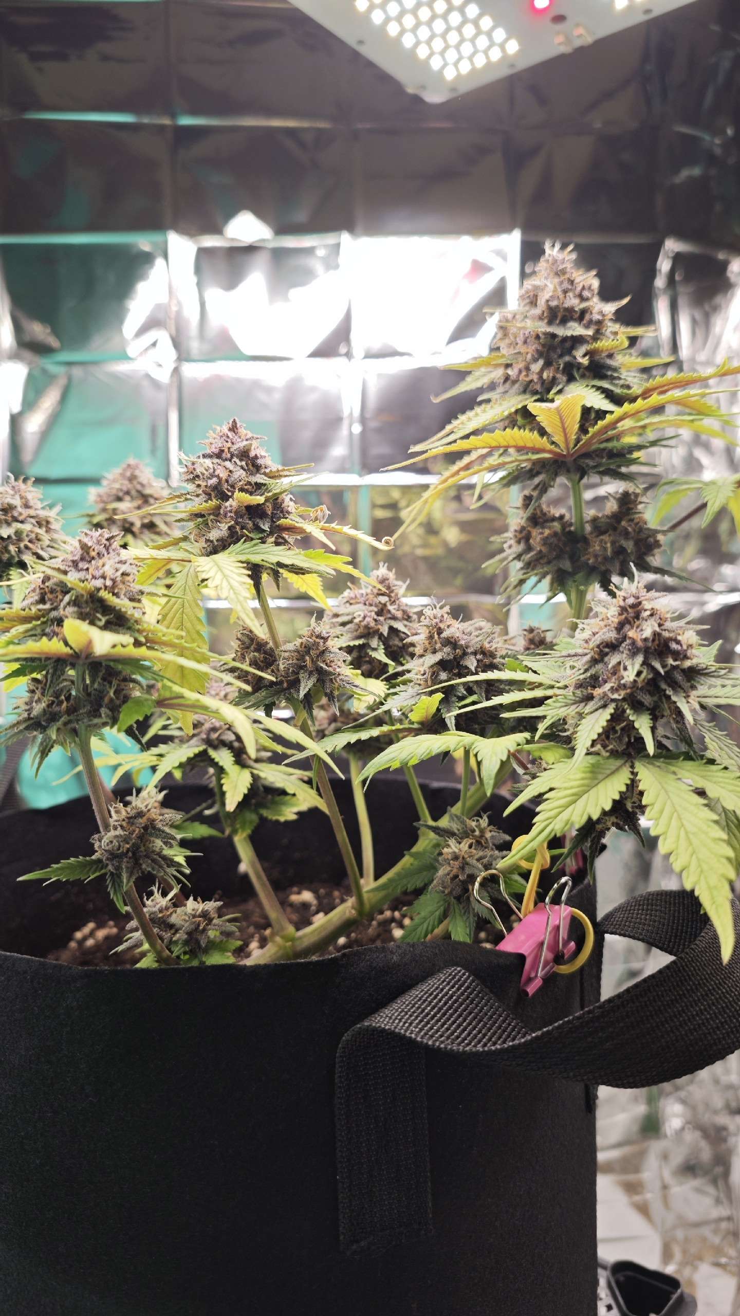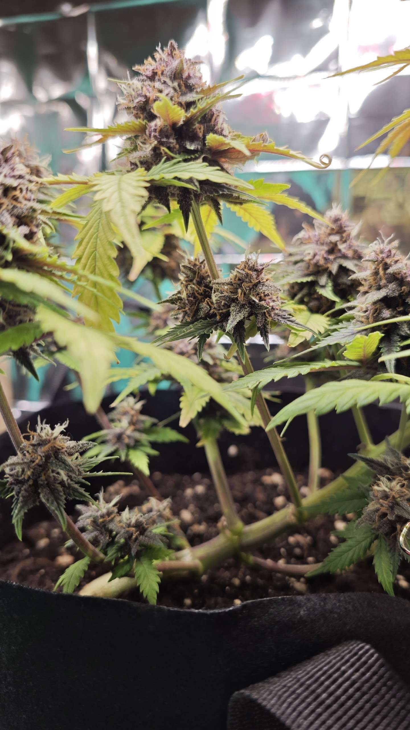 Начало девятой недели выглядит воодущевляюще. Шишечки подросли, листва стала меньше желтеть. Вид у нее все равно нездоровый - на паре листов пятна, а сами листья бледно-зеленые, но хотя бы не сохнут и не отваливаются. На 8 неделе было 2 полива по 2 литра. Компотик: На 1 л: гр 3 мл + блум 3 мл + топмакс 1 мл + калмаг 0,8 мл. И водичка с калмагом. ПШ всегда 6,5. На данный момент пользуюсь лакмусовыми полосками для определения пш.