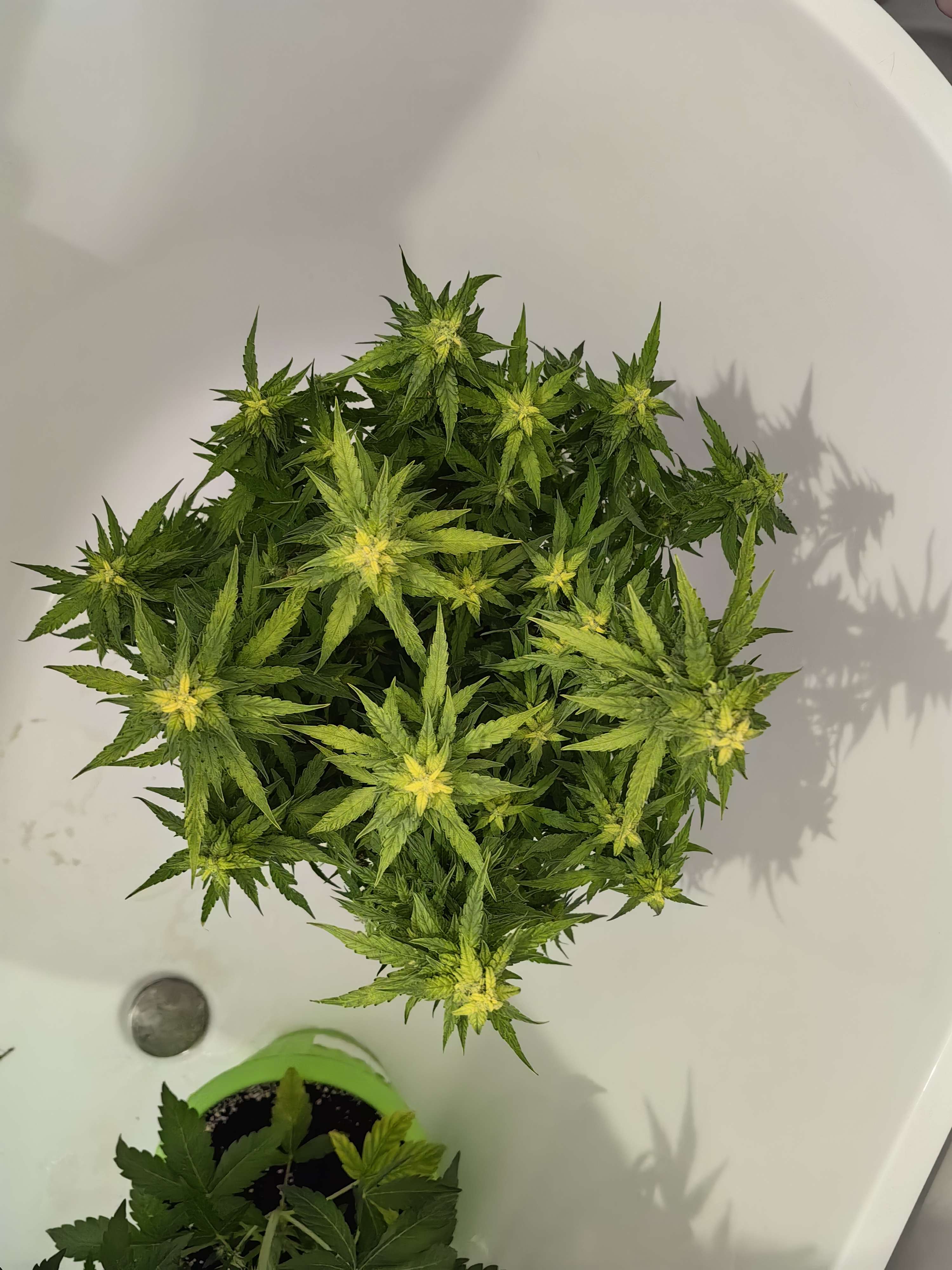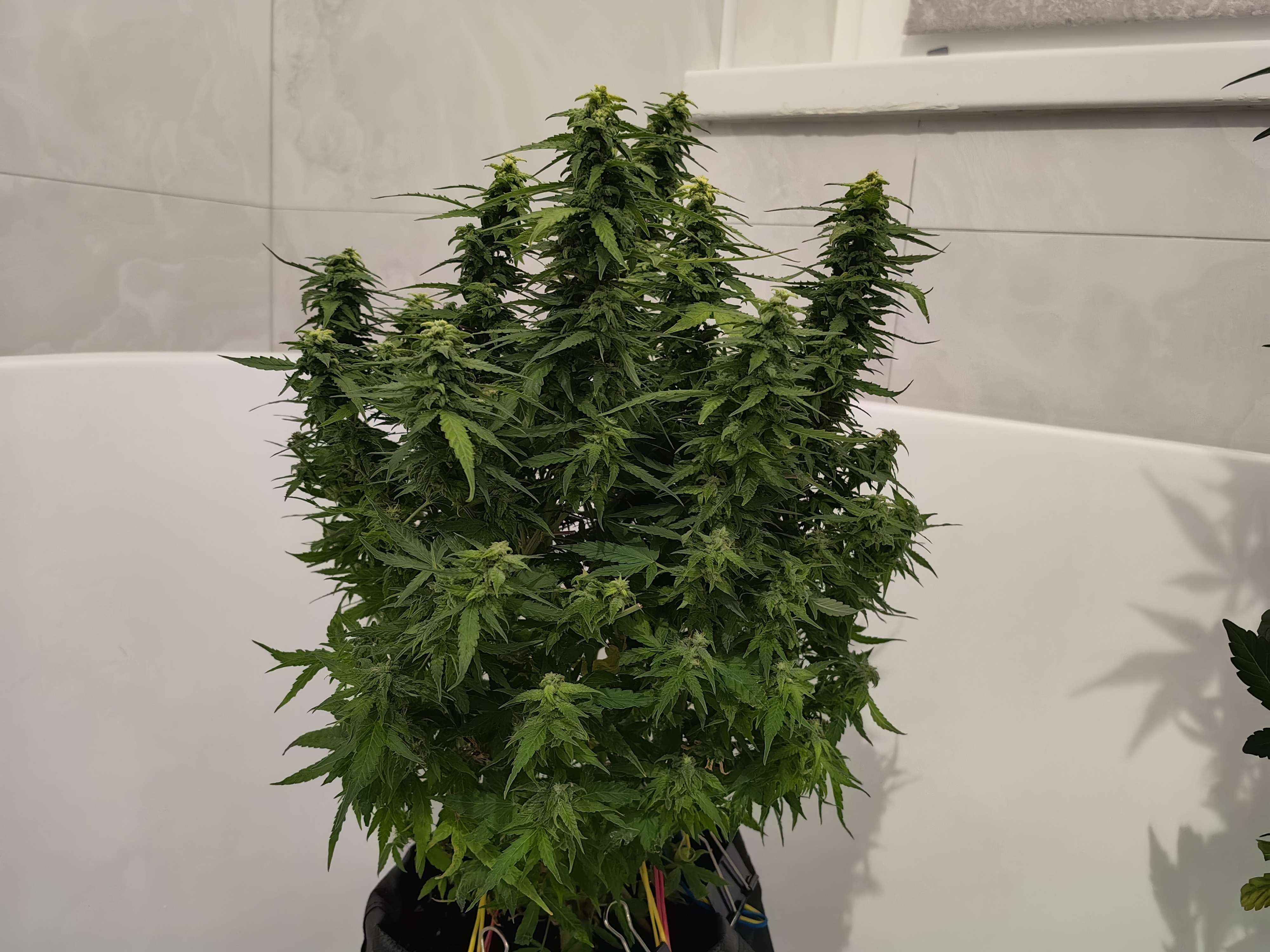 Ку! Вот и подошла 9-я неделя жизни зелёного монстра. Верхние головы все такие же жёлтые (хз почему). Стоим, пердим да кушаем. Белых стигм вообще не видать на верхах, на низах ещё что-то да есть. Удивляет количество бутонов — они прут из каждого межузлия. Сахарка накидывает здраво.