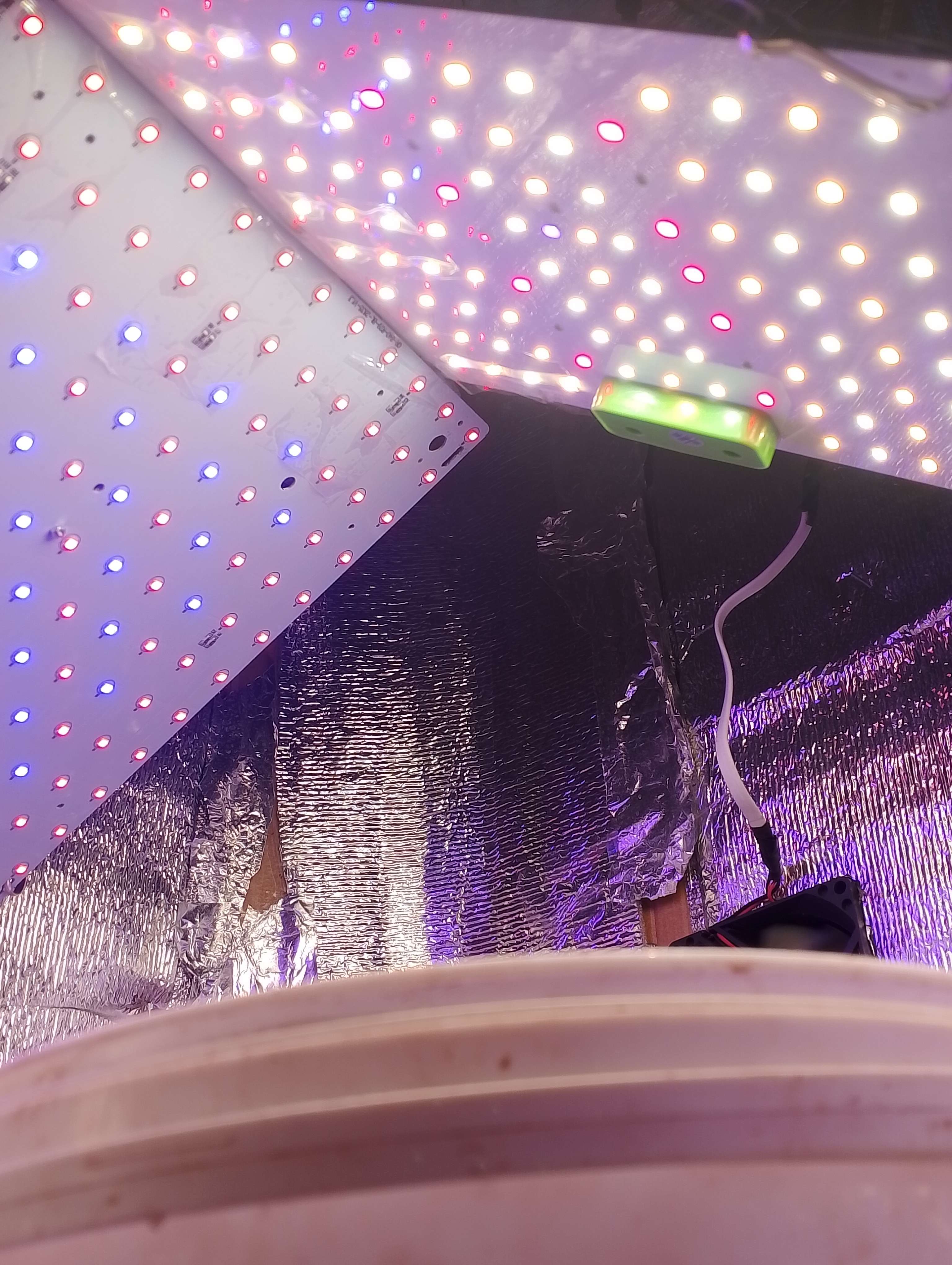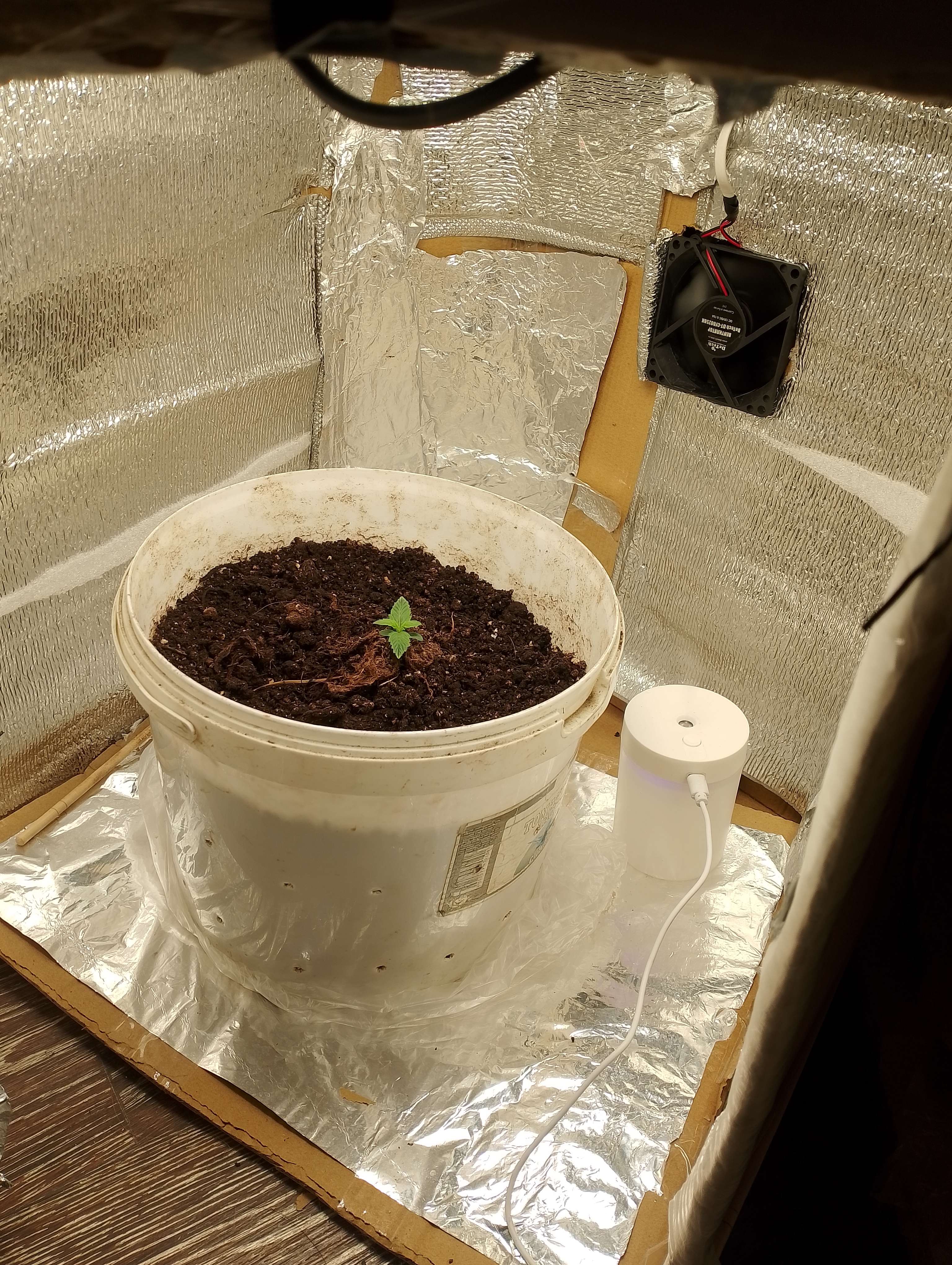 02.15 Начинаем быстро расти и радовать меня еще сильнее. Пришла вторая лампа с красными и синими диодами, она не такая яркая(хоть она и больше 25х25) как основная(20х20). Еле-еле запихал все это в коробку, чуть с ума не сошел:tooangry, но я справился установилих прикреплю фото может кто даст совет как лучше их закрепить, но как по мне вполне удачно 35000-37000 люкс от макушки. В процессе роста буду их поднимать вплоть до потолка, так же из за двух новых ламп поднялась температура до нормальной(с 21 до 25). Вообщем растем. Думаю с завтрешнего дня начать поливать маленькими дозами азафоски (по несколько грамм на литр) и увеличивать объемы поливов. Рад послушать советы и подсказки так же будет инетерсно ваше мнение насчет моей девчонки:veryinteresting