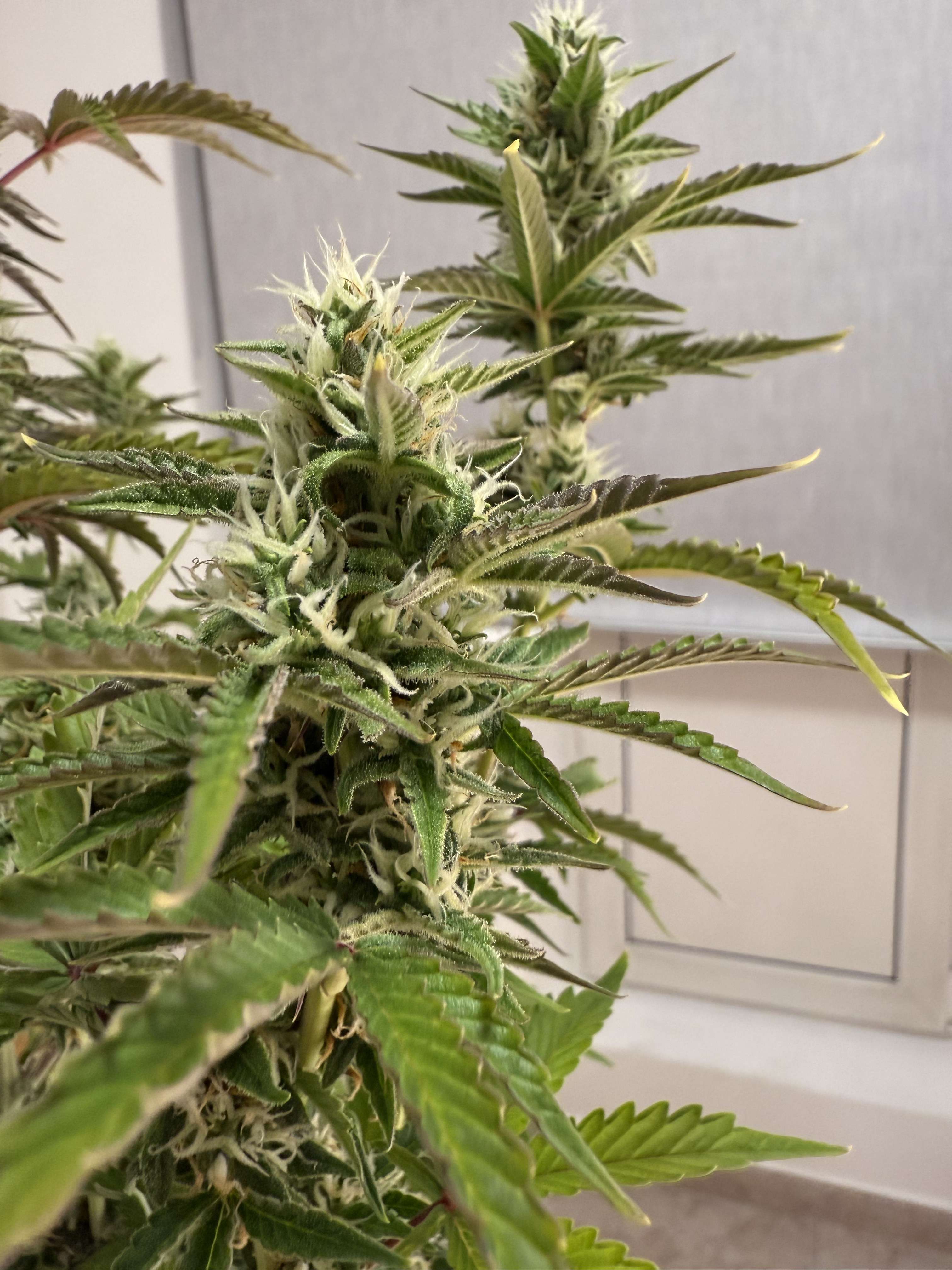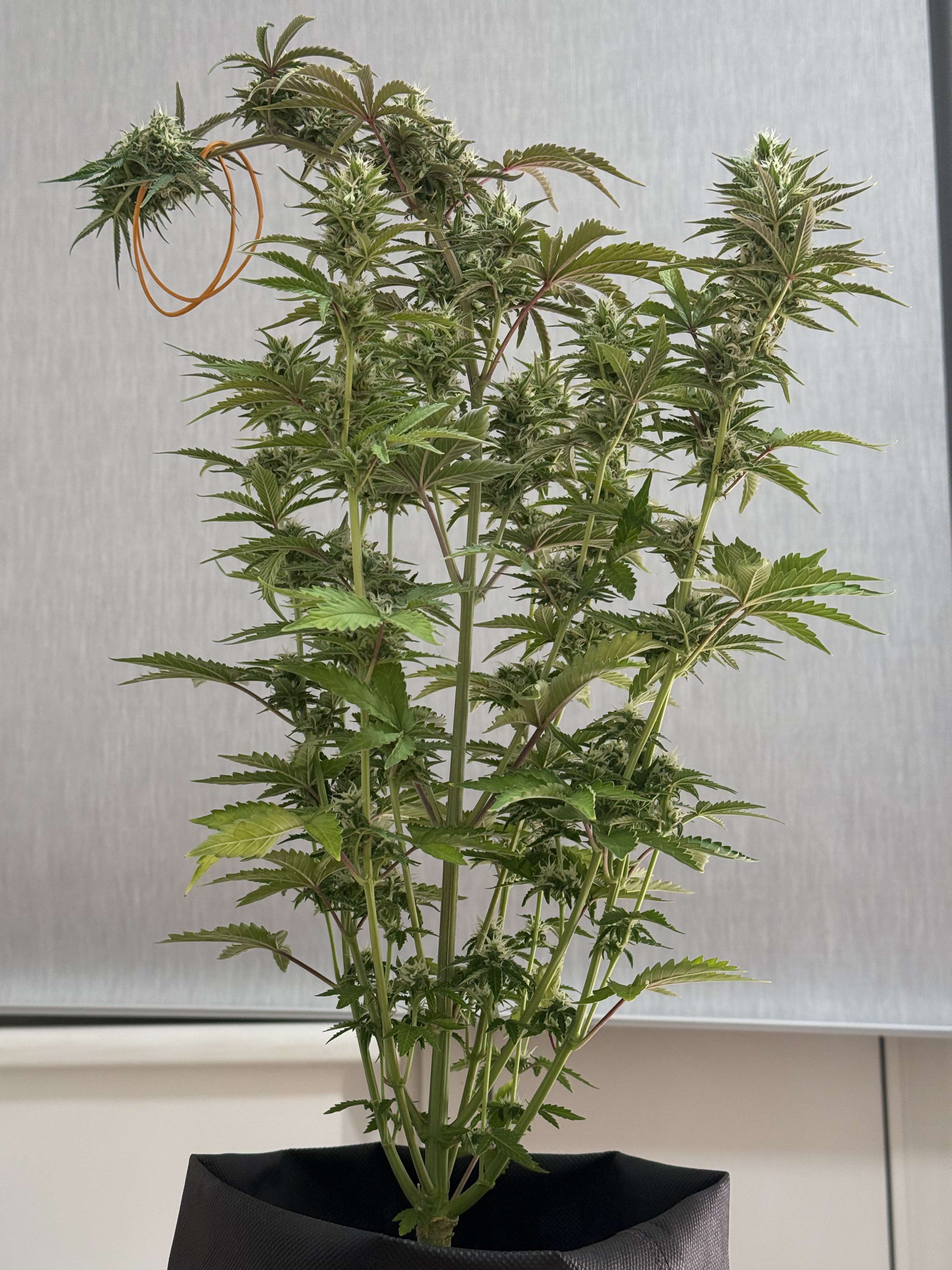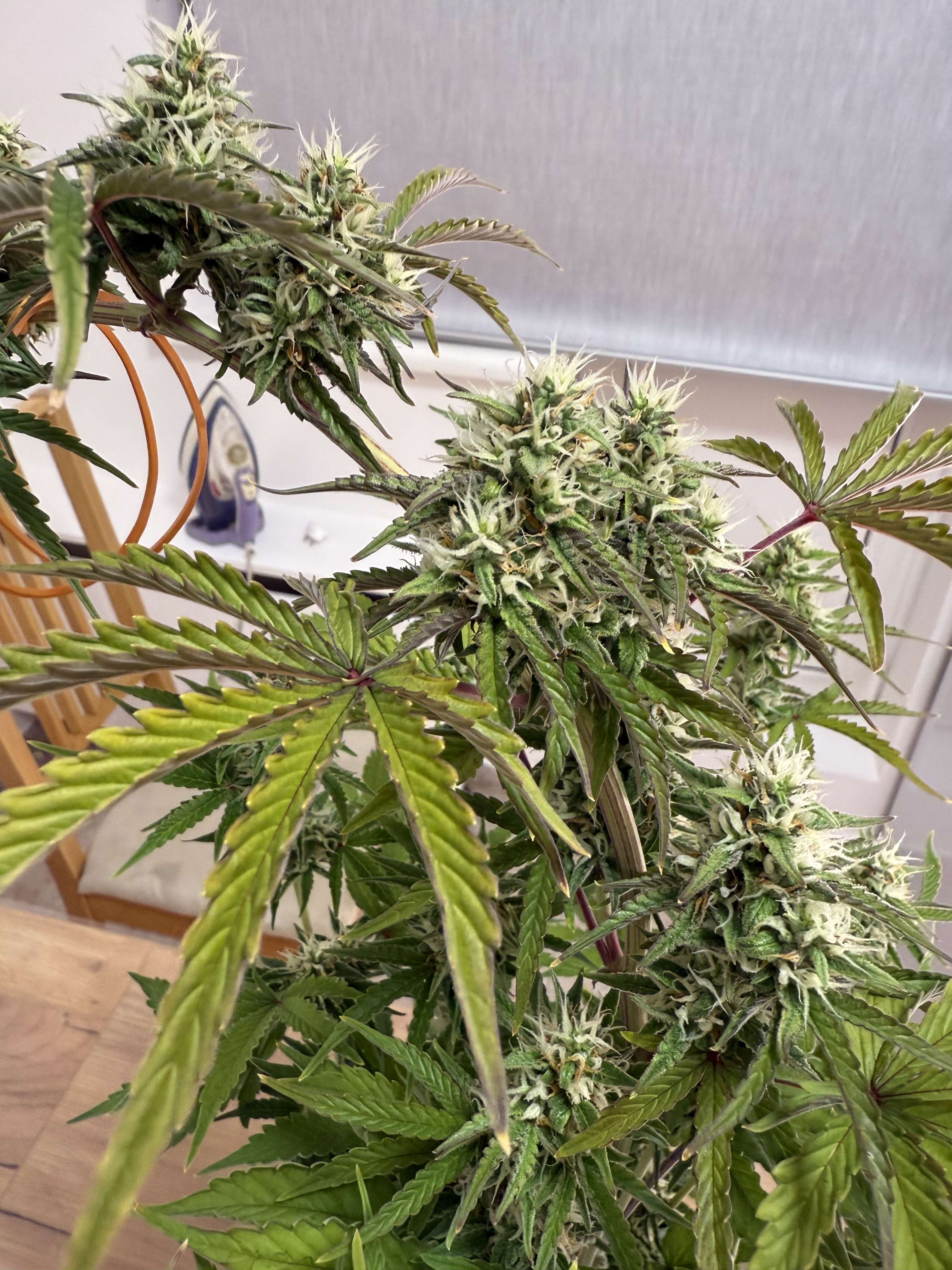 На Флоре верхняя часть с шишками и листиками начала приобретать фиолетовый оттенок - проявляются гены от Перпл Хейз.