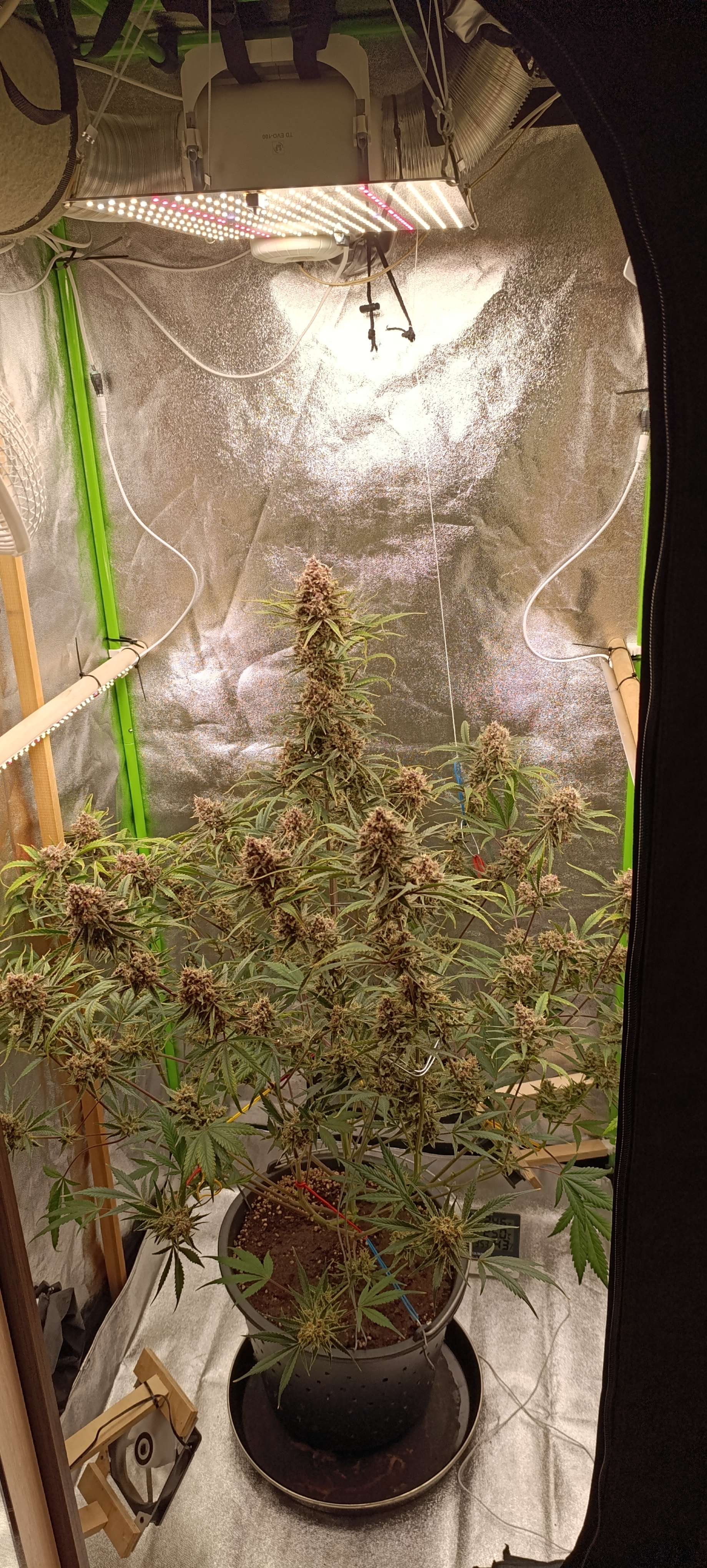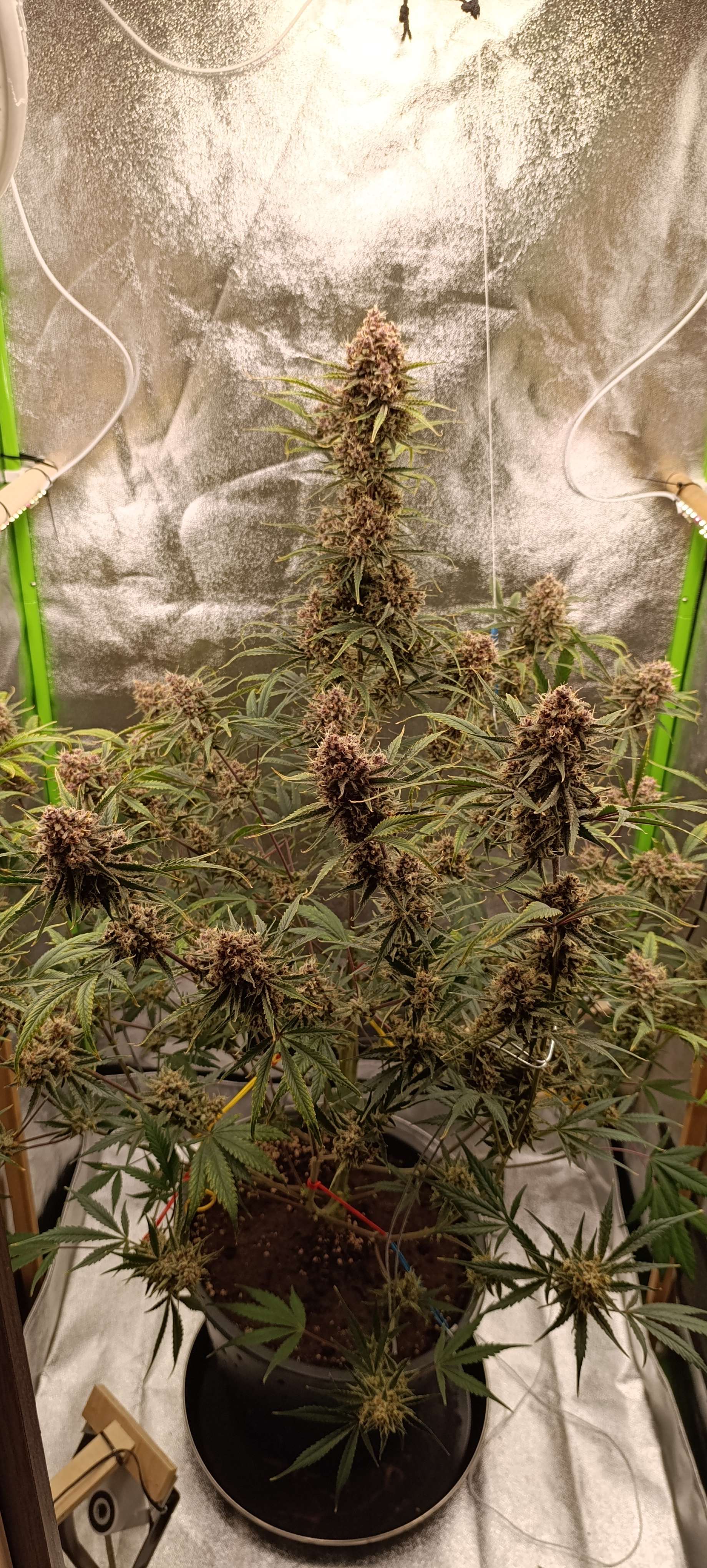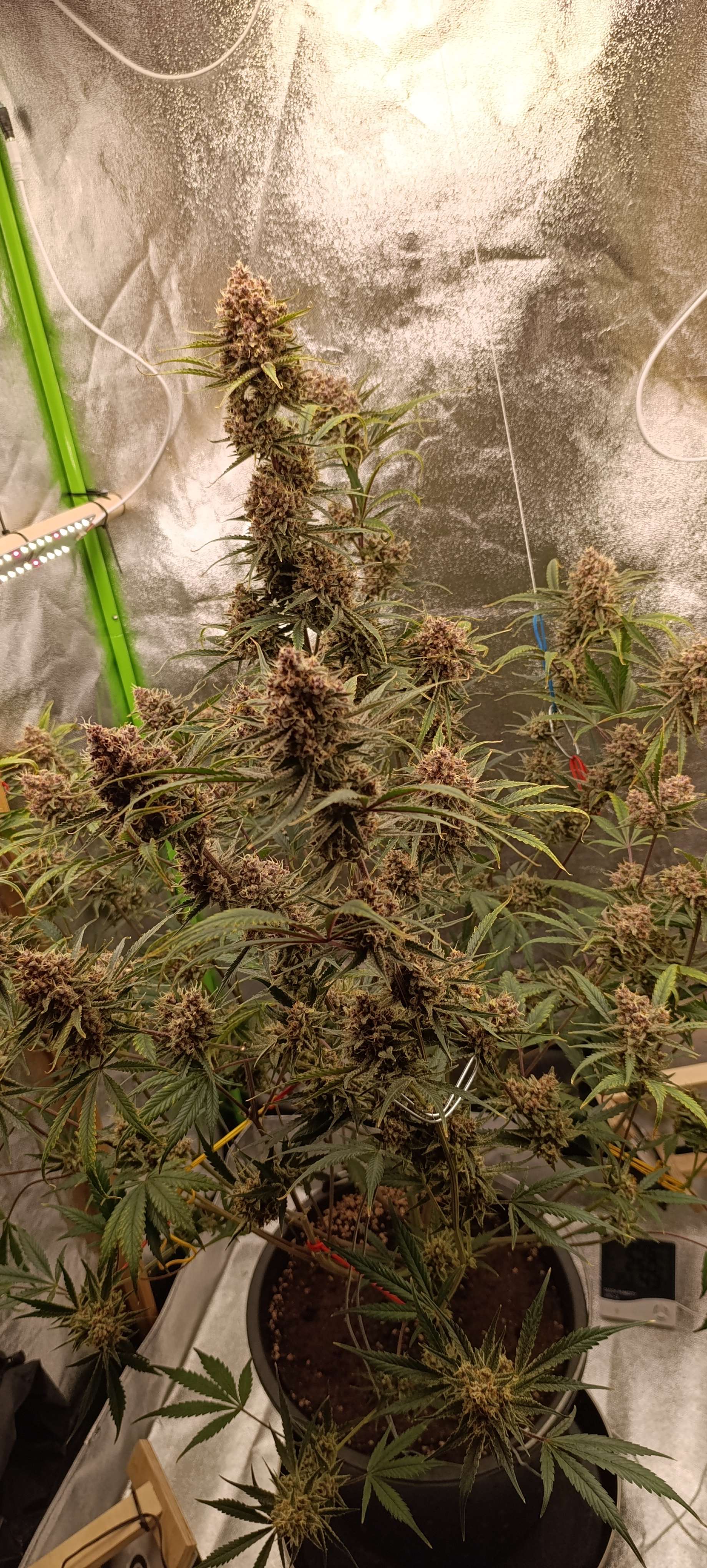 Полили компотом, четыре литра. Дренажа грамм 50. Пухнет, вся уже подвязана. Стебли получились тонкими, вес шишек не удержать.🫣