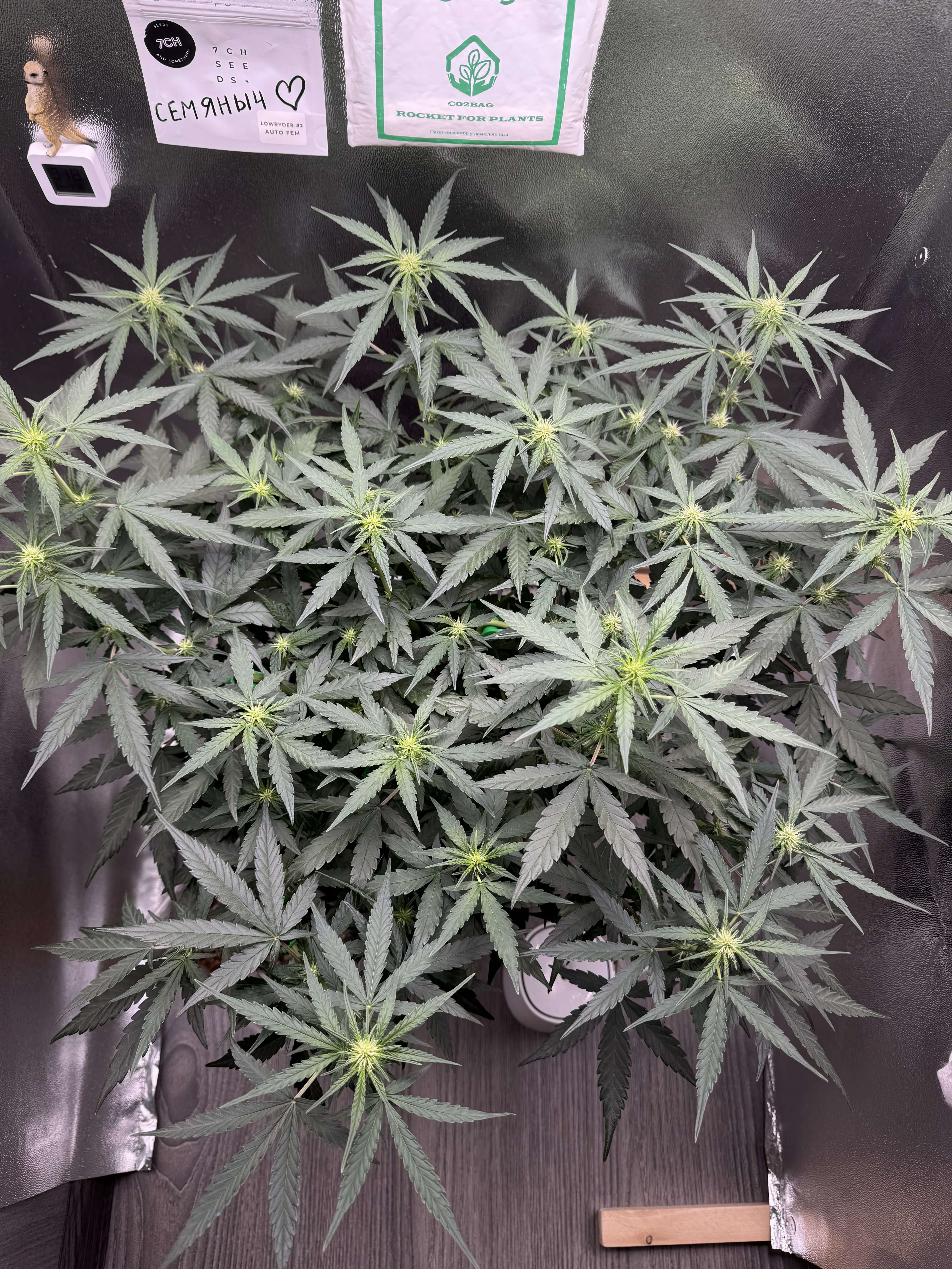 1-2 фото Провел повторную обработку от клещей Фитоверм + зеленое мыло. Можно считать борьба с ними вроде как завершена. Кустик хорошо разросся, даже пришлось двигать боковую ширму. Решил повесить CO2 пакет, хоть и не вижу смысла в нем, так как окна открыты, но пускай будет. Провел еще одну маленькую дефолиацию, убрал парочку листьев в центре.