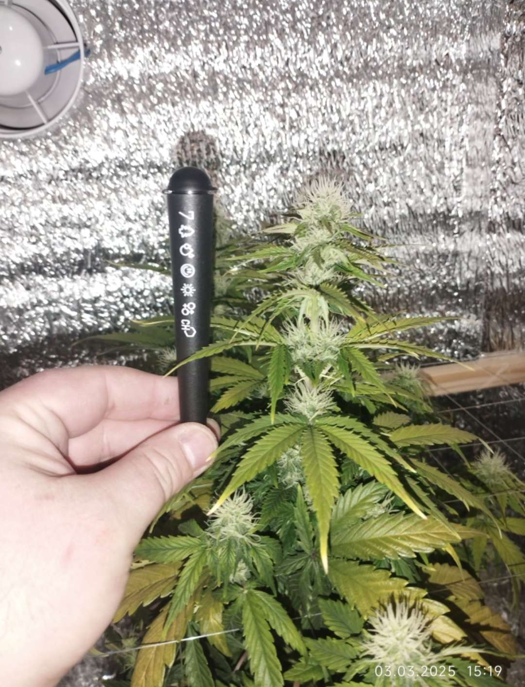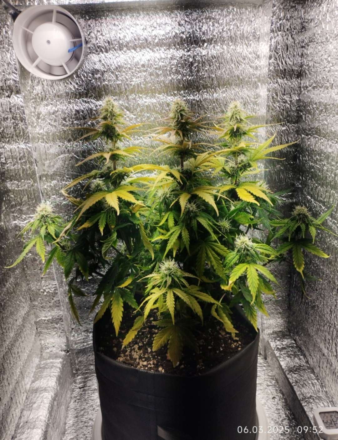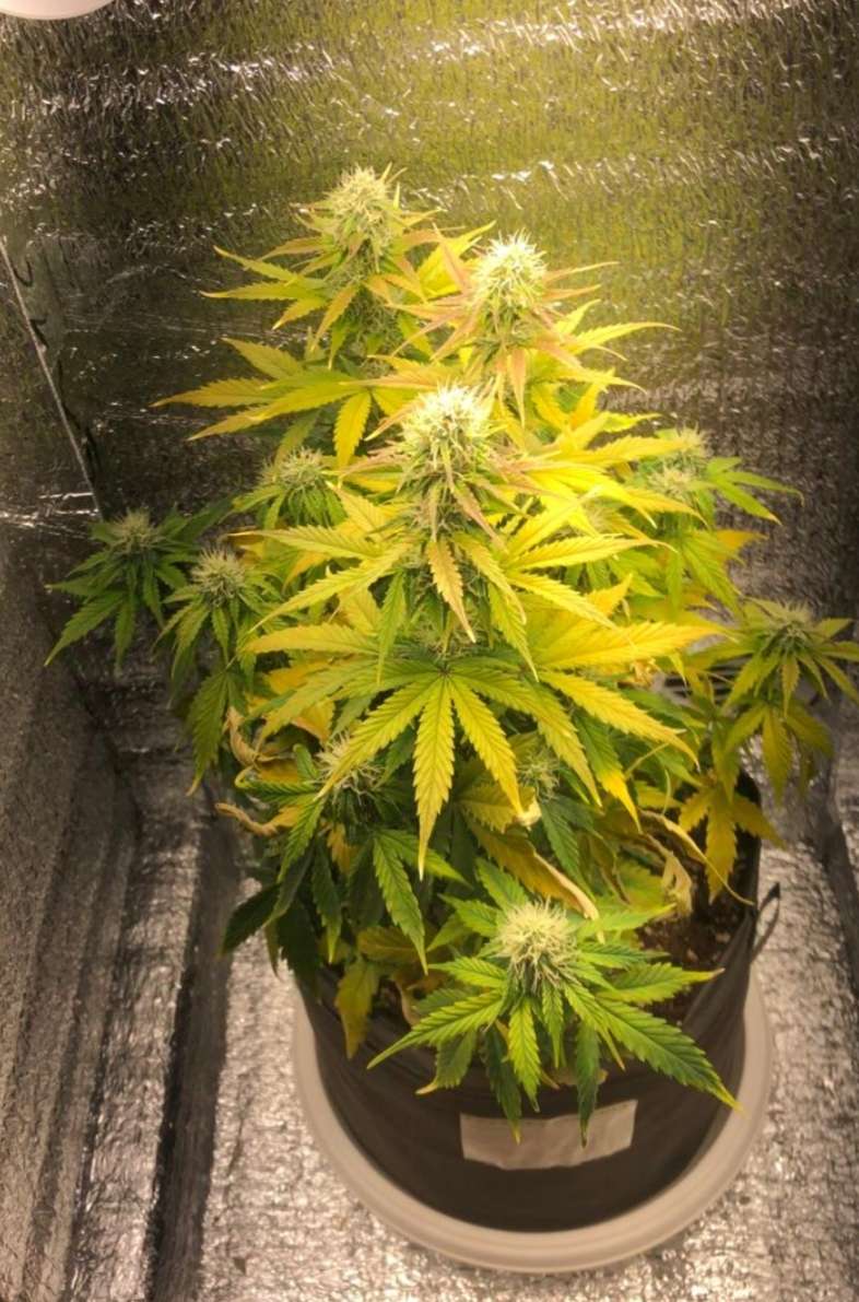 И так, по советам многих, я увеличил полив с 1л до 3-х, раз в 3 дня, проливаю до дренажа. Я снова упорол косяк, без этого походу не могу:hmmm, держал её на безводной диете, не допивала она у меня, бедняжечка...плюс, затянул с удобрами, что, она начала сама себя курить, листья пожелтели, многим на столько пришёл финиш, так пришлось их порубить. Но и это ещё не всё, сейчас она у меня в жёстком стрессе. 6-го числа, мне пришлось перенести растишку в прохладное место и перевести ей световой режим с 20/4 на 12/12, эти мучения она будет испытывать до 10-го числа. Надежда на температуру в боксе, хотя бы около 15 градусов. Так же, этим же днём был произведен полив компотом 3л 6.8ph с 1.5мл Grow, 2.1мл Micro, 3.15 Bloom. Пойти и глянуть что с ней, появится возможность только 10-го, такие вот траблы. Буду надеяться не на лучшее, но хотя бы на что-то):pray
