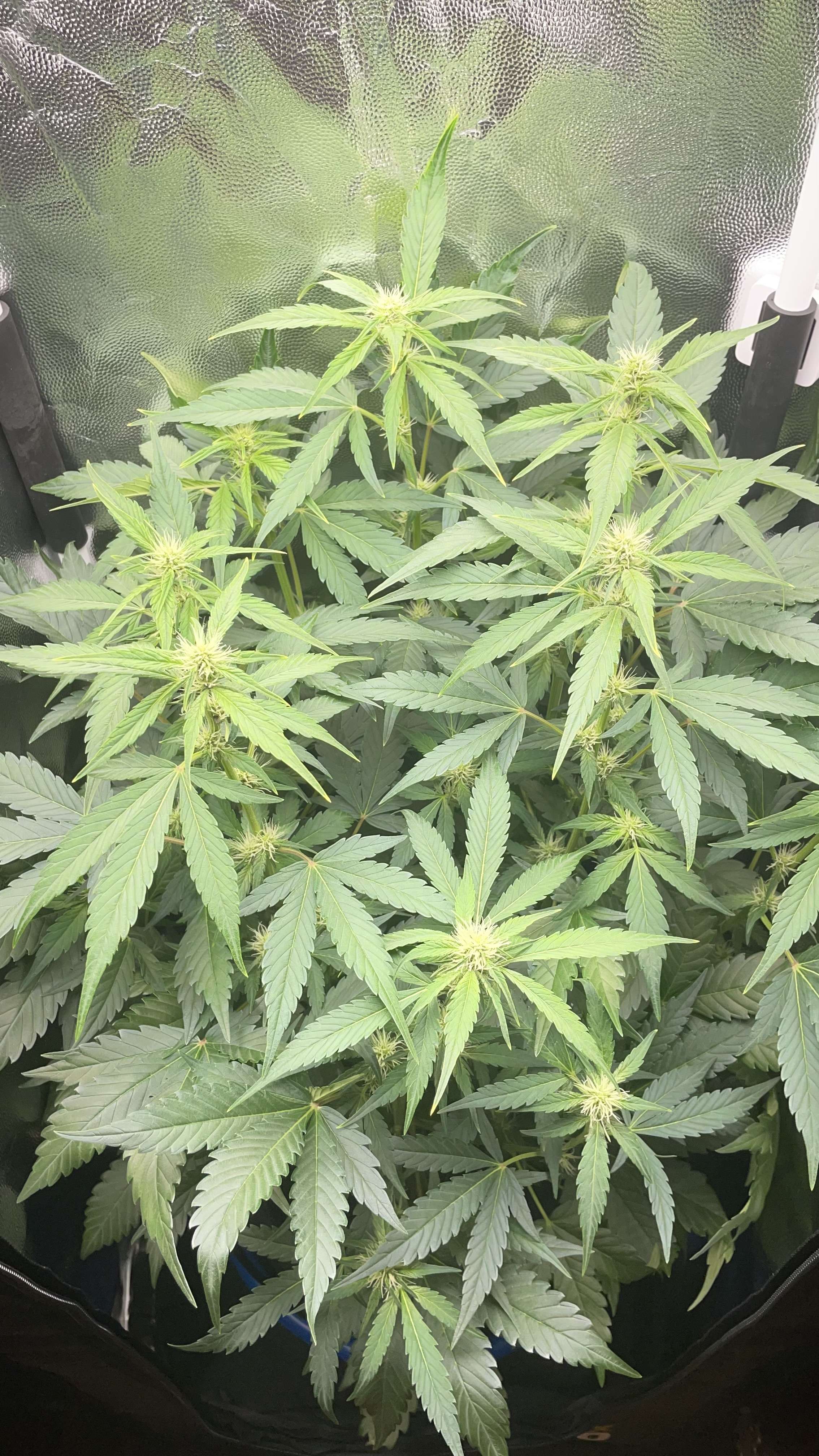 За неделю малышка выросла почти на 15 см. Из за обильного полива или плохой вентиляции (подключил фильтр и не добавил скорость вентилятора) потемнел ствол возле корня, но вроде приходит в себя. И еще немного желтеют кончики верхних листьев и несколько листьев о сохли и упали, хз норм это или нет. А так в целом рад и доволен. Единственно минус это маленький бокс, 40х40, но больше не влез в шкаф🤣. Буду рад критике или дельному совету, первый раз все таки, переживаю 😬