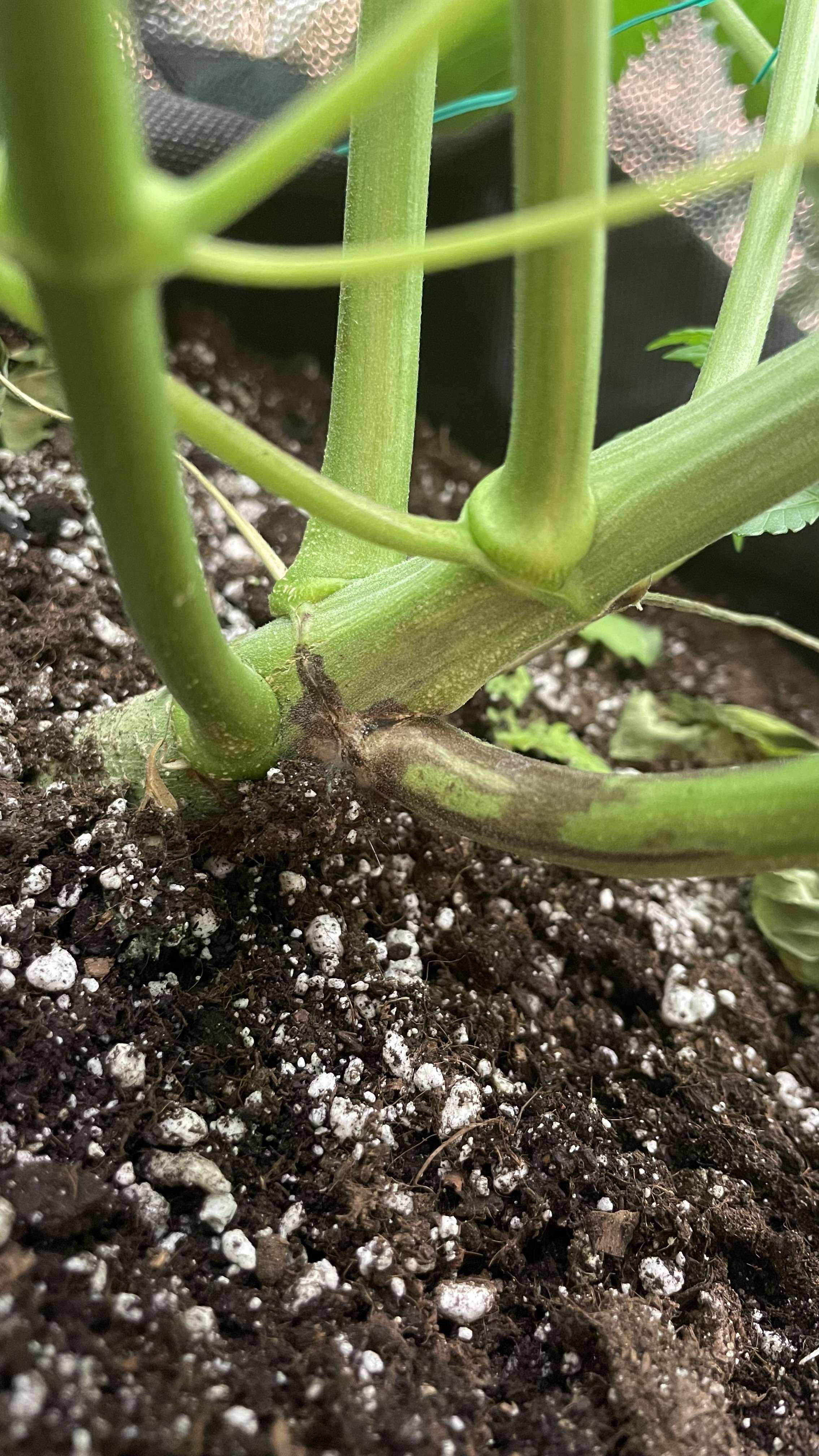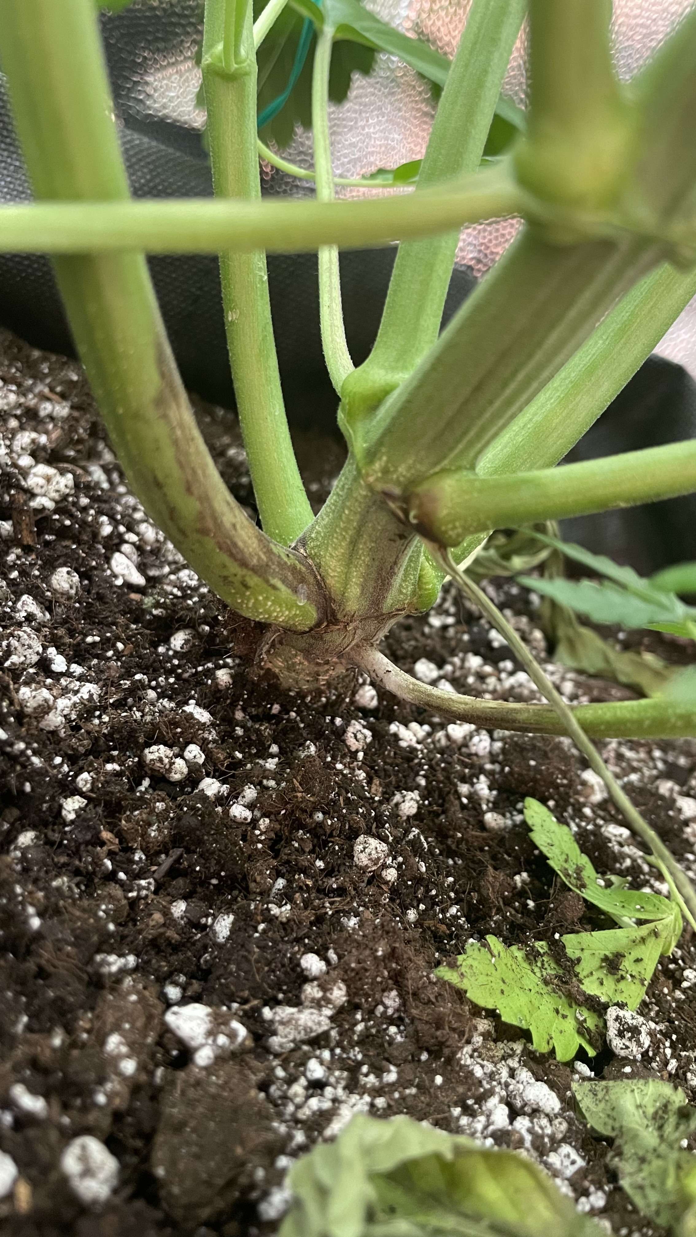 Горшок очень большой - 20 л. Влага застаивается, просыхает медленно 2-4 дней и при этом посажена растишка "глубоко" - нижние узлы веток практически "плавают" во влаге.. Тут либо горшок поменьше чтобы просыхал быстрее, либо не сажайте растишку "под самый дольный листик". У тебя там грунт? Тогда советую именно на этом этапе цветения пролить хорошо грунт (позже может стрессануть и шишки не наберут размер). Если дренаж будет ок.2500 ppm, то проливай до 1500-1300 ppm смело для грунта.