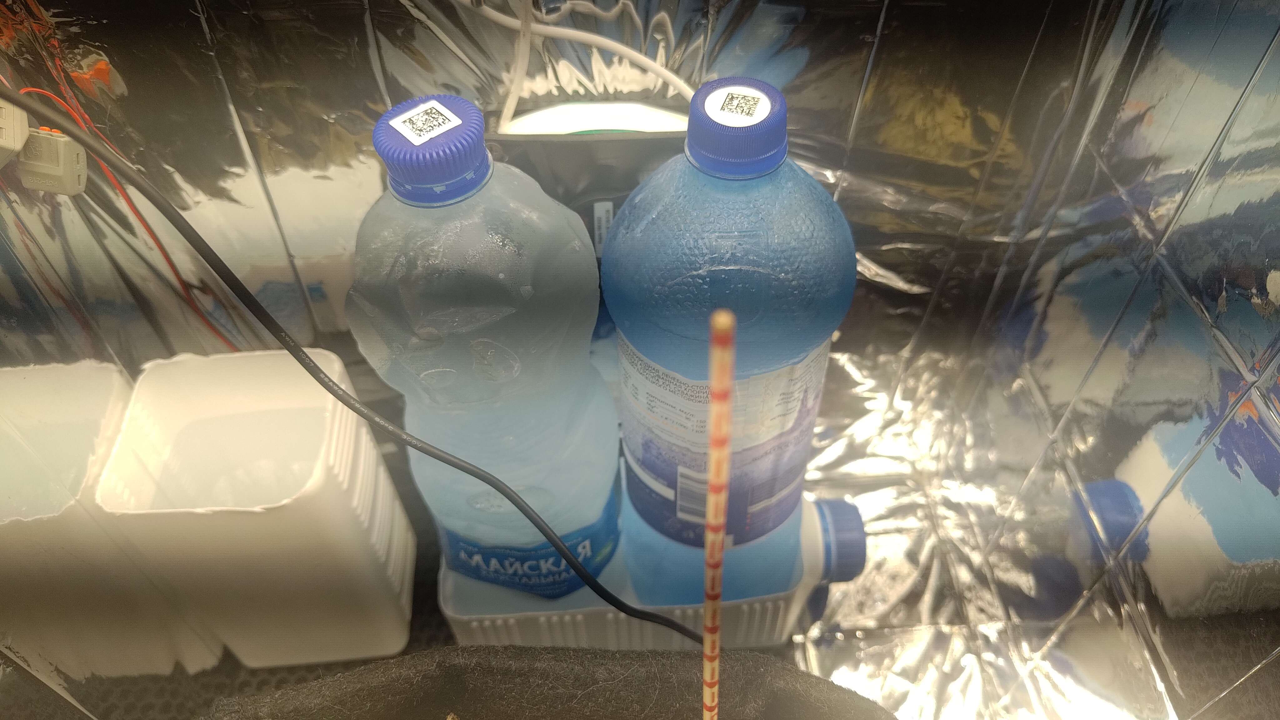 Две 1.5л бутылки со льдом и тарой под ними чтоб меньше конденсата стекало в сам бокс.