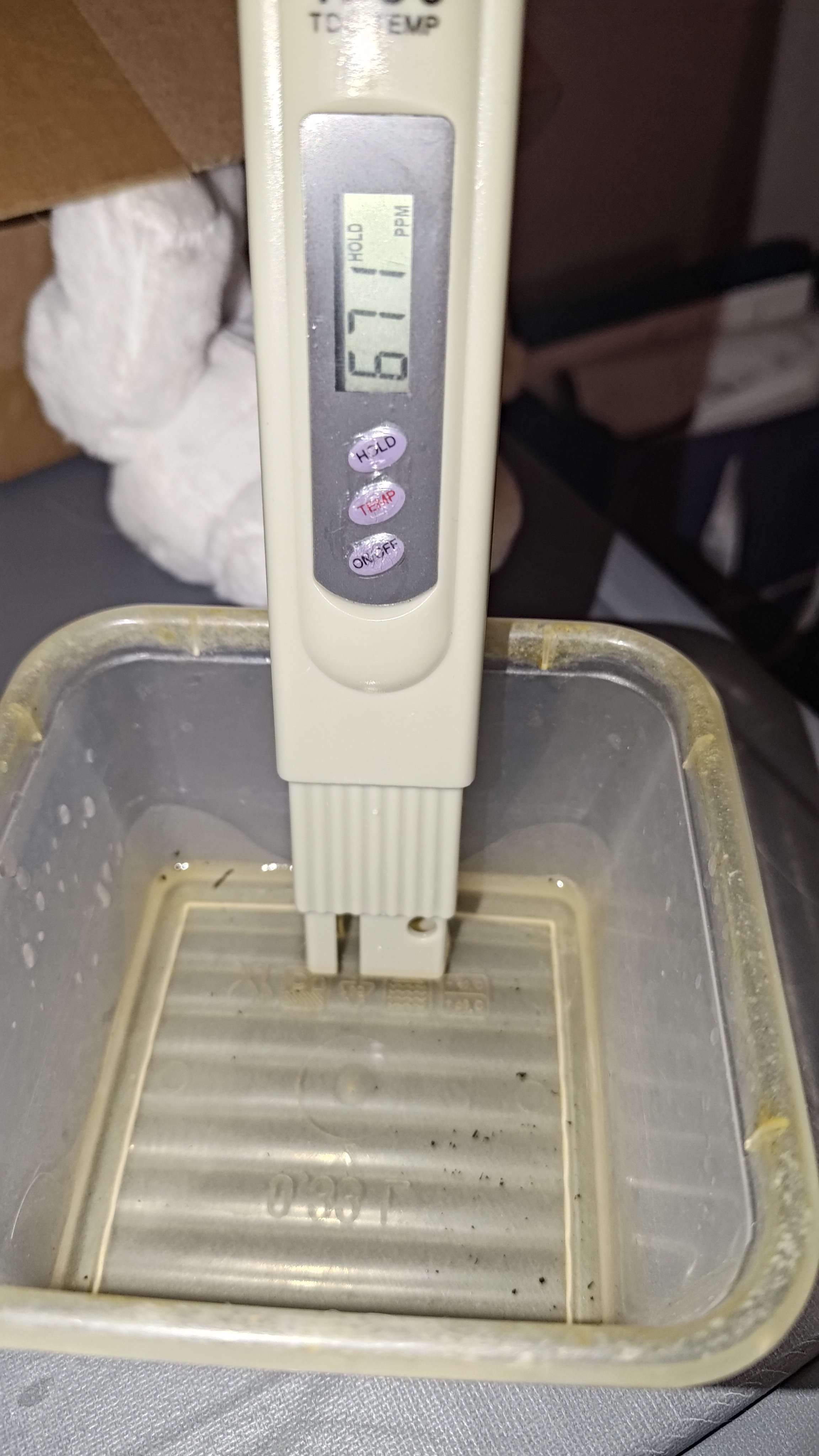 Листики начали немного подворачиваться, решил полить чуть раньше чем перед выключением света, вылил 0.5л 6.2Ph 29ppm. Раста находится рядом с краем горшка, когда проливал, немного вытекло с боковушки горшка, буквально 20мл, решил собрать и померить ппм, а про пш забыл, но там и так еле хватило количества жидкости чтоб померять, по итогу на фото 670ppm. Если я правильно понимаю то ничего плохо ведь не сделал, что немного вытекло во время полива? Следующий полив планирую скорее всего в субботу утром, ей будет 13 дней, нормально для такого роста?