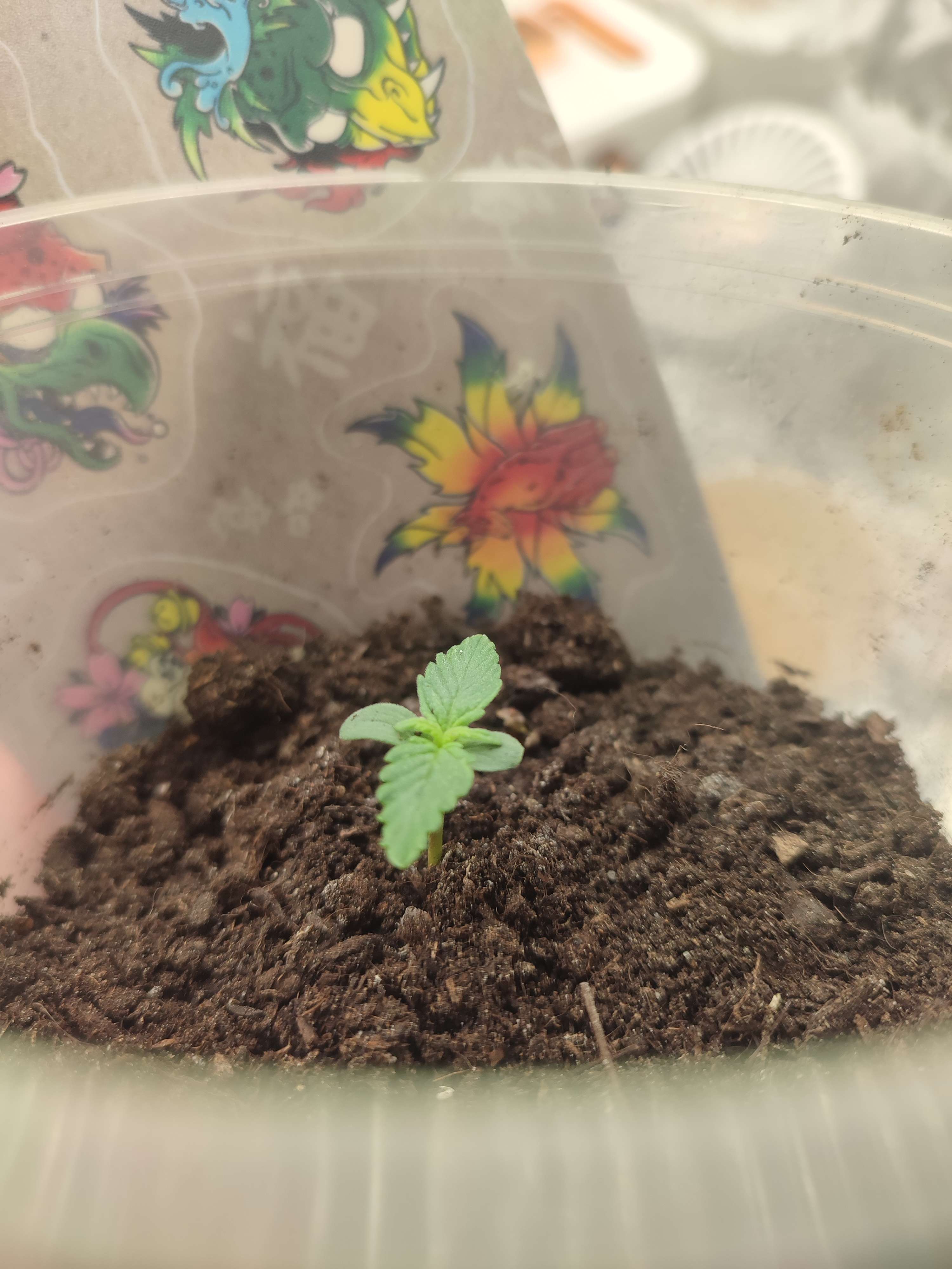 Я бы уже пересадил наверн, в горшке сделал бы ямку и из стакана вместе с землей переставил туда, присыпал.