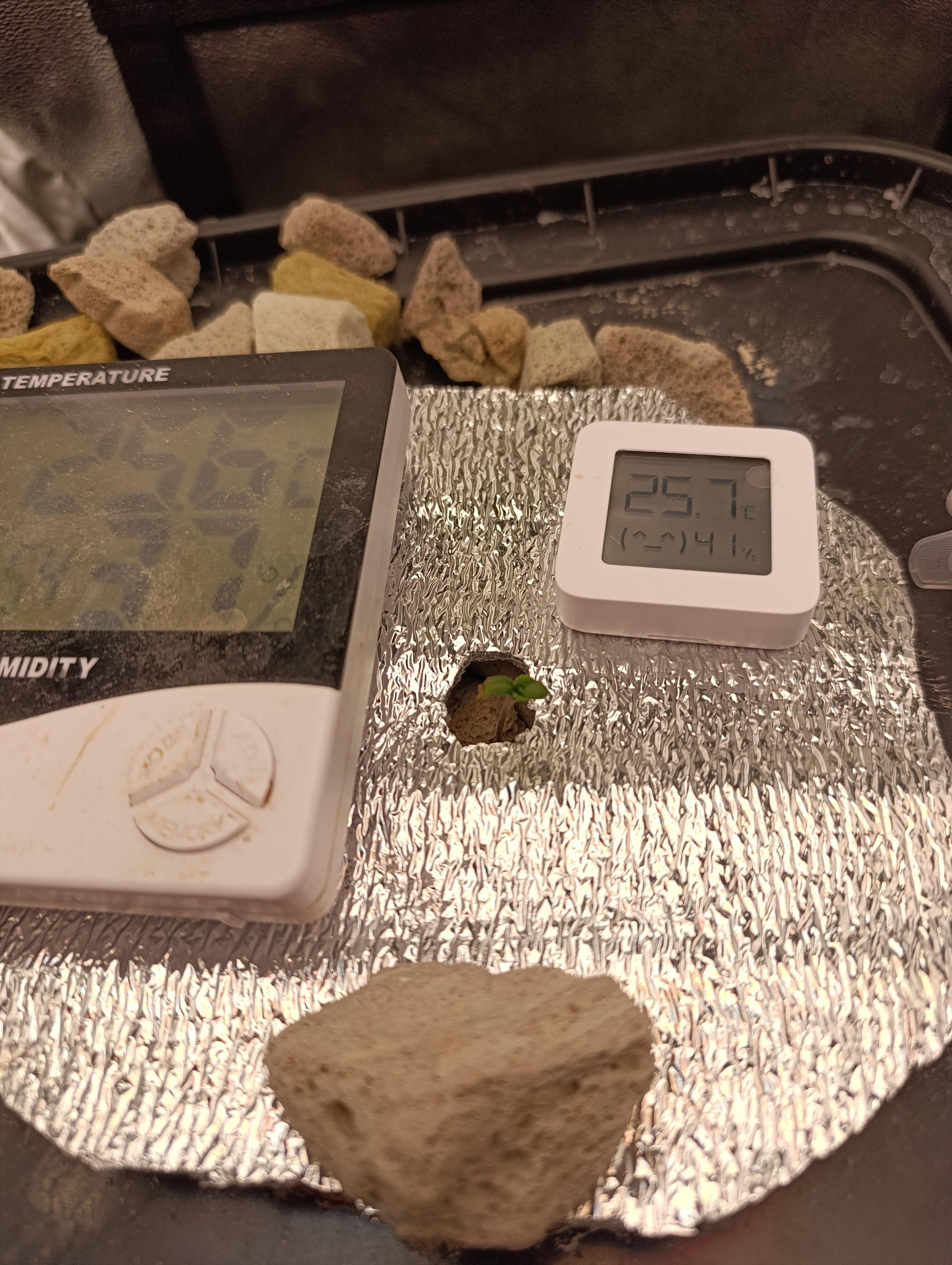 Замешал компот на 1100 ppm и 5.8 пш. За 5 см над дном горшка с субстратом положил минеральную вату и в нее семечку. На второй день росток уже сбросил каску.