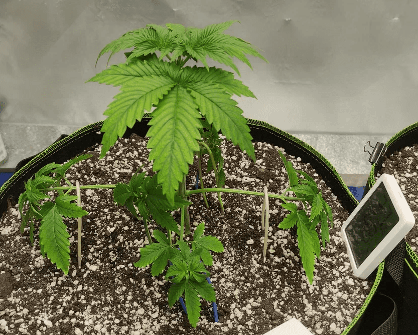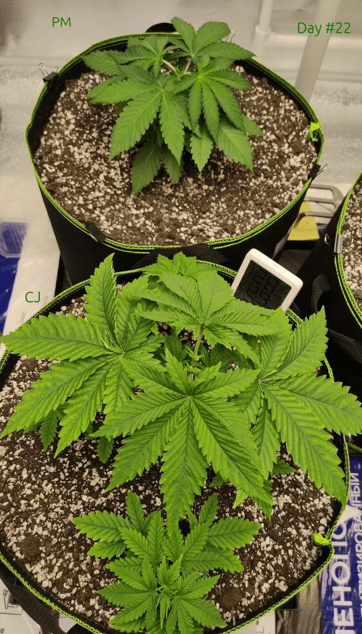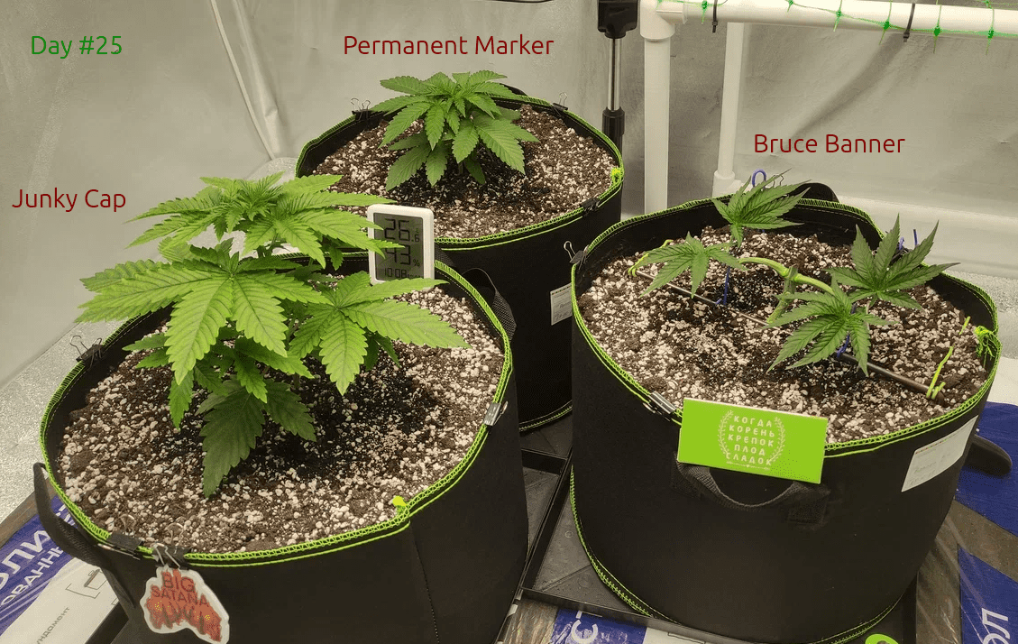 Убавил свет с 50% до 38% (от 700 Вт), хочу проверить как Маркер отреагирует, а то высота у него 14см (у Джанки 24, это при всходах в один день) и кустится вширь.