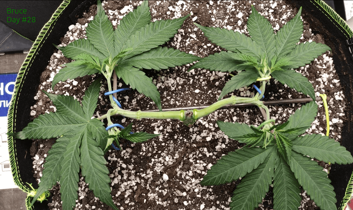 На этой неделе, на 19й день (он на неделю отстает от Брюса), топнул растиху, обрезал лишние (имхо) листья и пригнул боковые колы. Топнул 7й этаж.