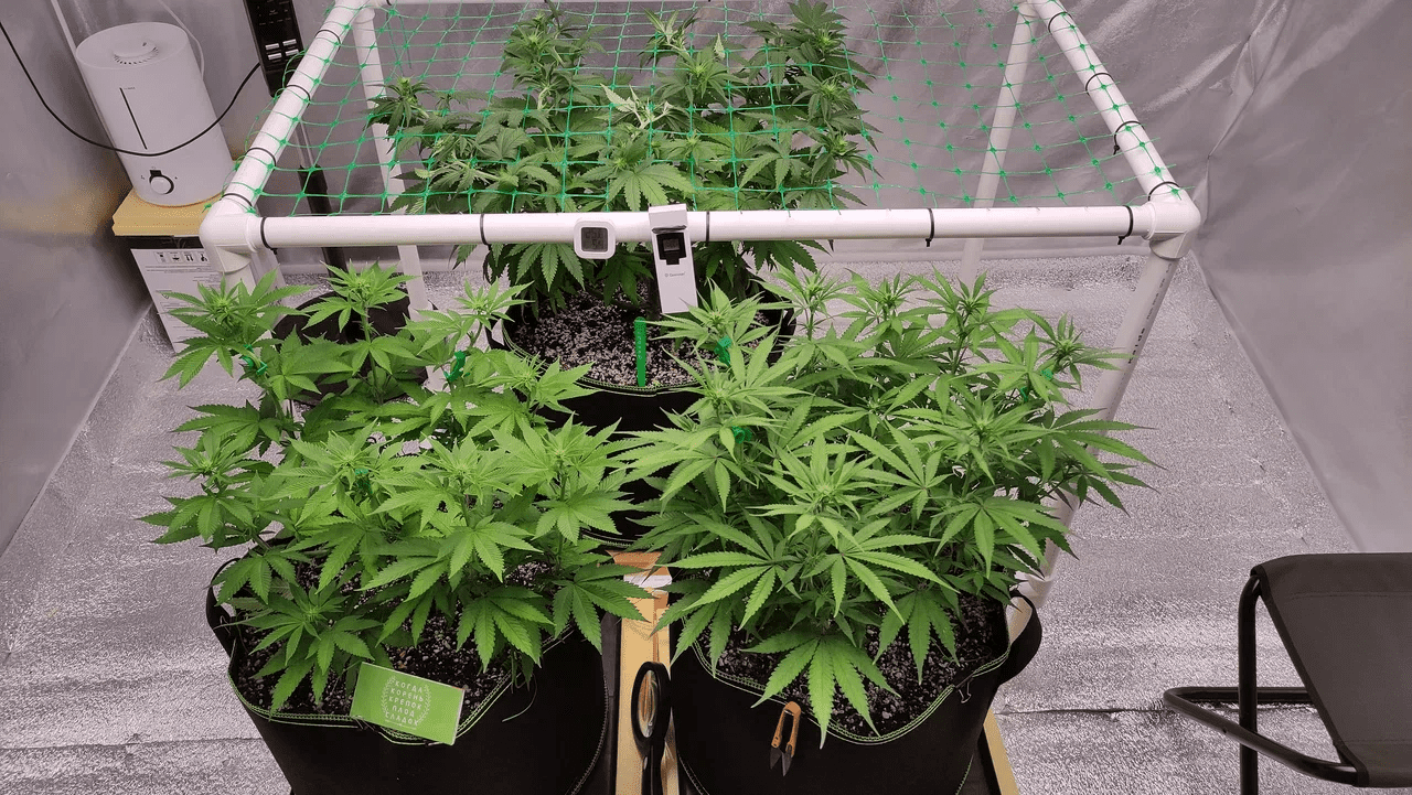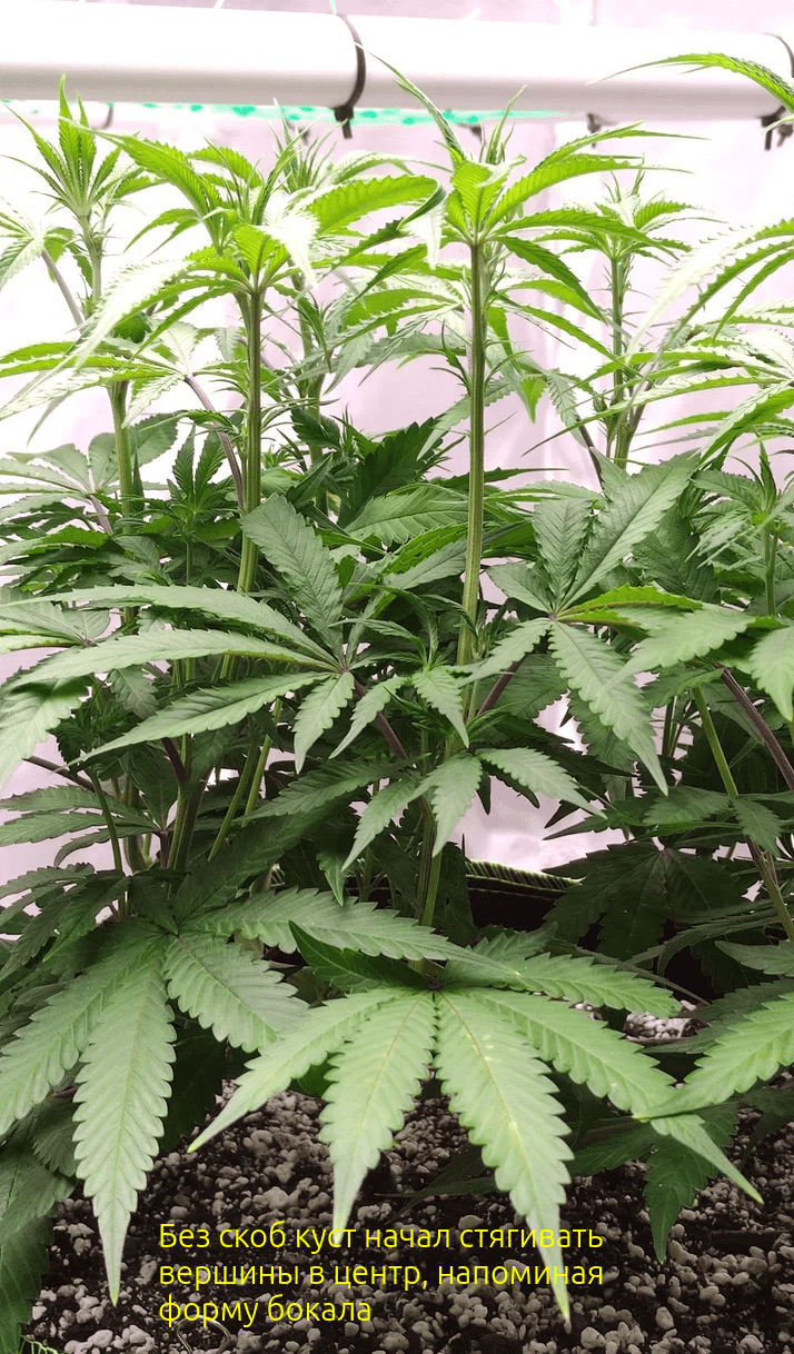 В последний день недели с утра установил лст-клипсы на 3 из 8 самых высоких кол. Это должно запустить гормональное перераспределение и дать подтянуться отстающим колам. Через 12 часов после этого, когда кончики кол выправились вертикально, развел все колы небольшими растяжками от центра, чтобы серединка "задышала". По возможности заправил затеняющие листья под кандидатов на лилипоп, чтобы без лишней дефолиации дать больше свет отстающим, затененным.