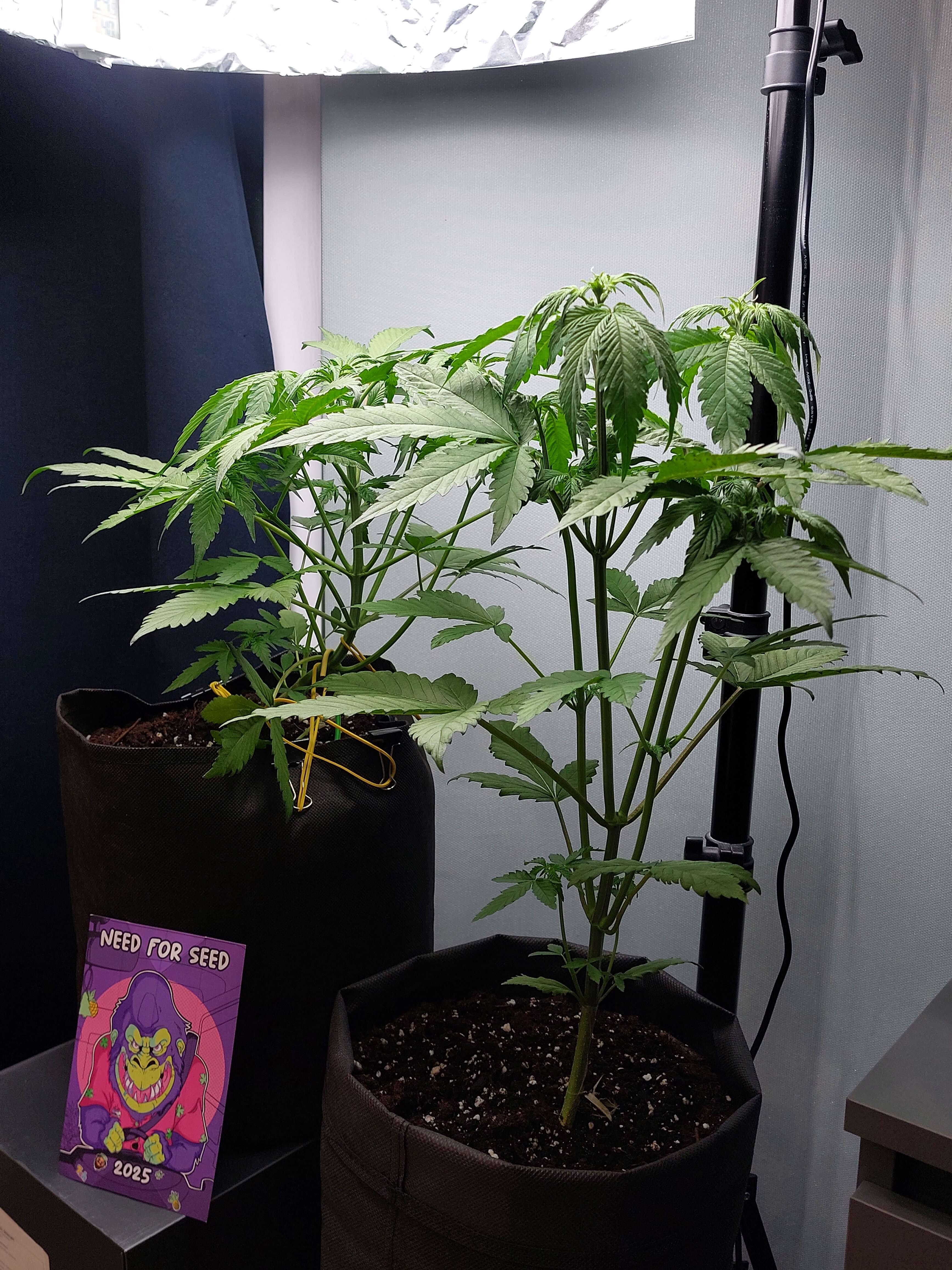Позади 4 недели. Кусты заметно тянутся, но и прибавляют листов и ствола. Три дня назад появились волоски на обоих кустах 👍 Запах стал сильнее. Сегодня заметил пятна на 2х листах. Думаю ожог. Так как они впритык к стенкам с фольгой самодельного торшера. Против света пятна особенно видны. Ну поднял, подвинул, но это неизбежность. Дальше будет им все тяжелее с их размерами и моими условиями 😬 Ращу, как могу.