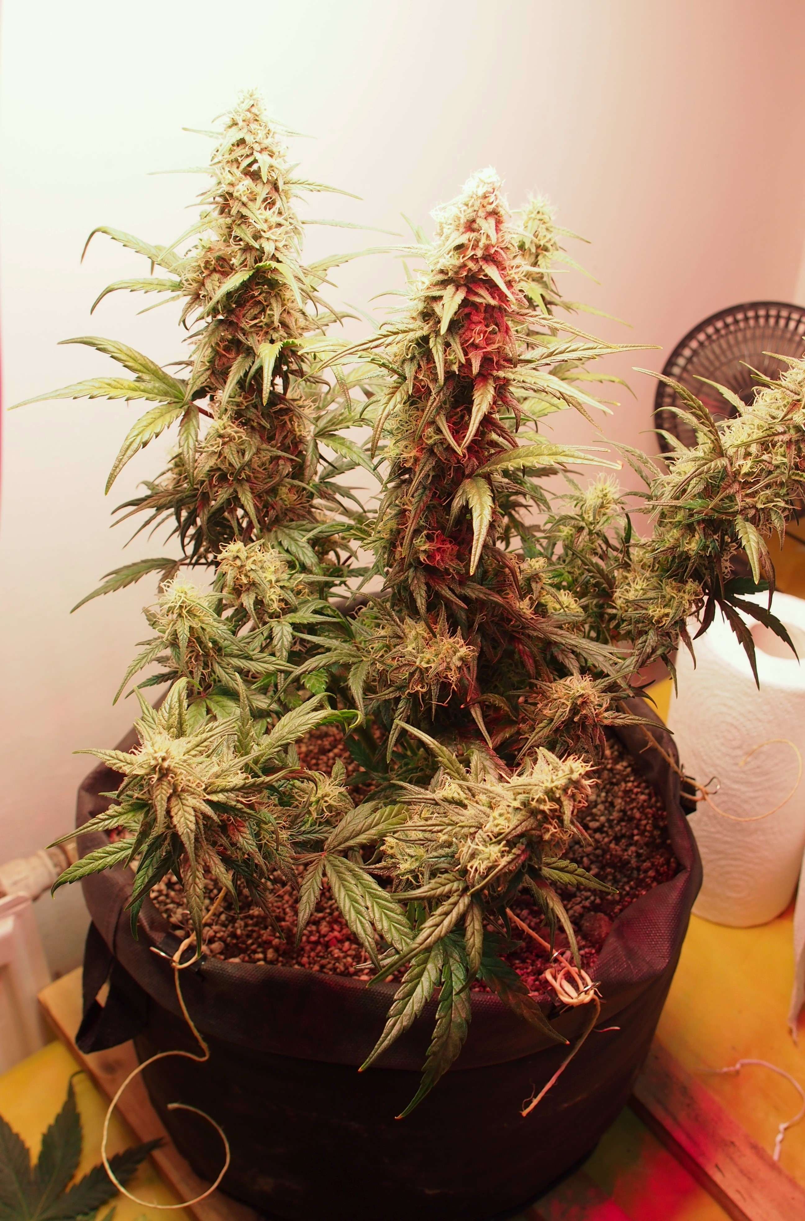 Что делалось с растихой на 7-й неделе: полив раз в три дня (горшок большой), применяю все стимы на цветение: ProBloom, Bud Blood, PK Boost, BigBud, FactorX, Fulvic. Давал на неделе мелассу. Свет убавил до 50тыс lux + много красного 660 nm. Небольшая дефолиация.